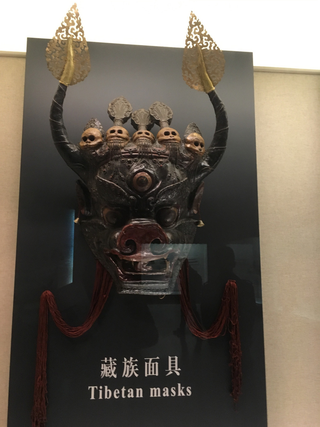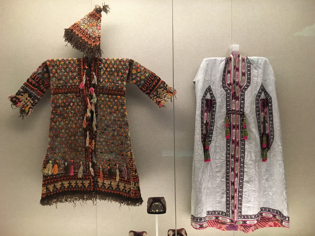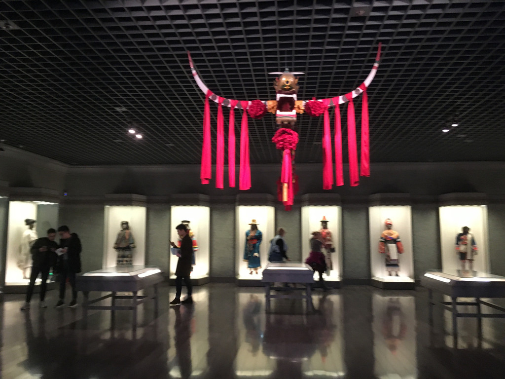 不知道是真牛角还是工艺品,上面垂着红绸,看着十分喜庆。后面的玻璃柜里,则是各族服饰的展示。