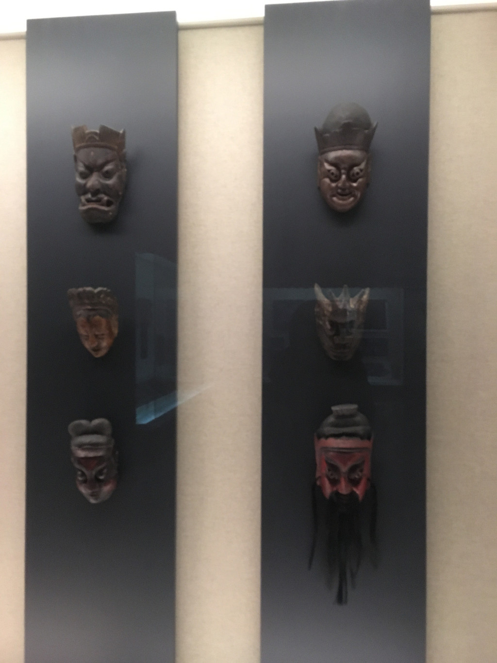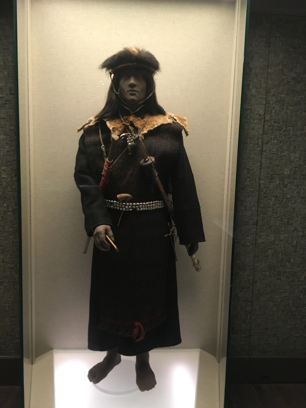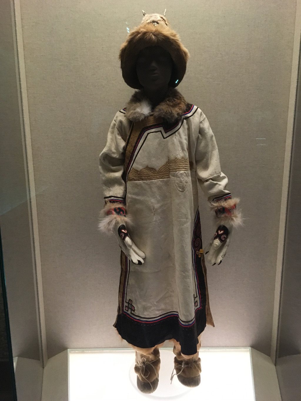 不知道是真牛角还是工艺品,上面垂着红绸,看着十分喜庆。后面的玻璃柜里,则是各族服饰的展示。