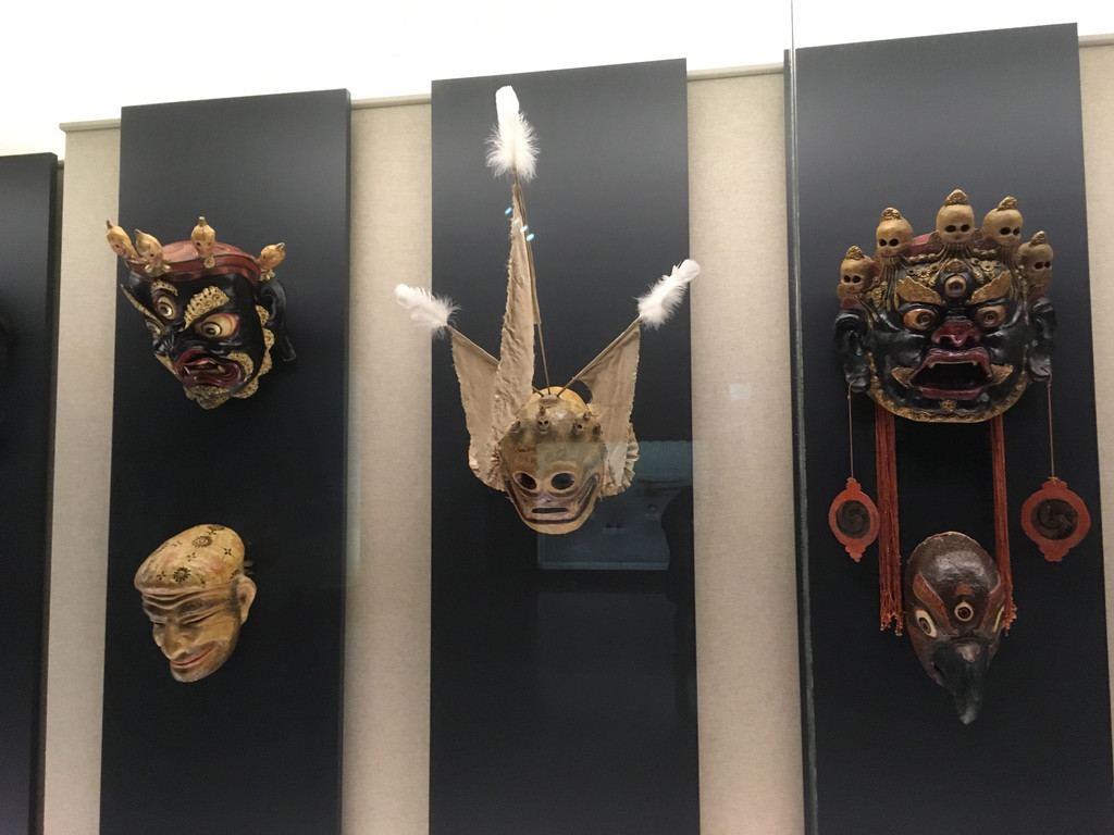 藏族的面具形式非常丰富,彩漆牛头明王跳神面具表现的是藏传佛教格鲁派密宗的护法神牛头明王,头戴骷髅冠,圆目暴突,形象威严。