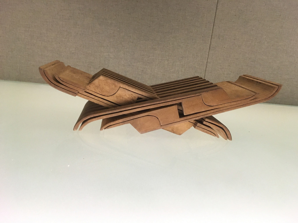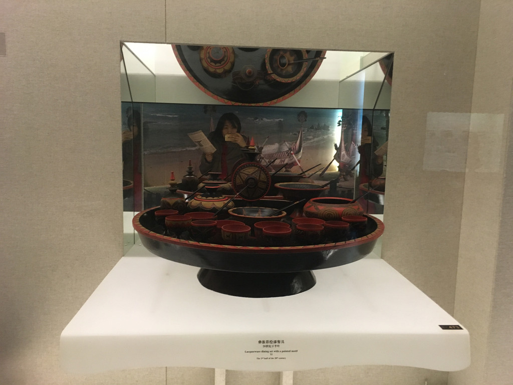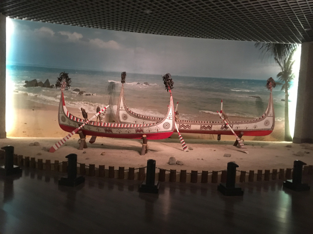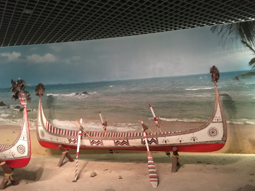 走到展厅的尽头有一块开阔的空地,是高山族彩绘木雕渔船。船只有点像贡多拉的形状,看起来也像是独木的。但是你看着它都不敢相信人家是艘渔船,白底红色花纹的船身,连船浆都彩绘着非常鲜艳的颜色,这分明是一件艺术品嘛!