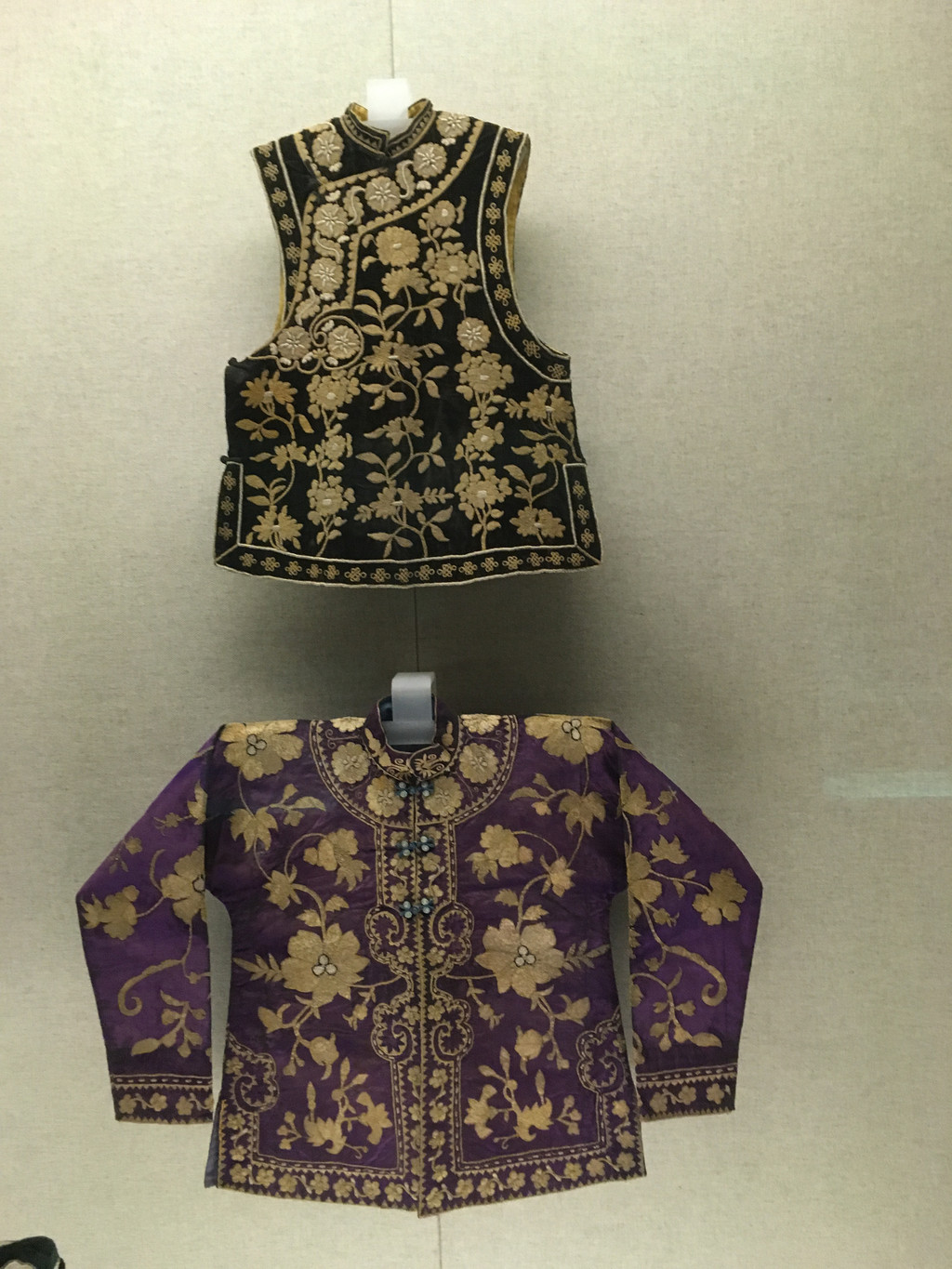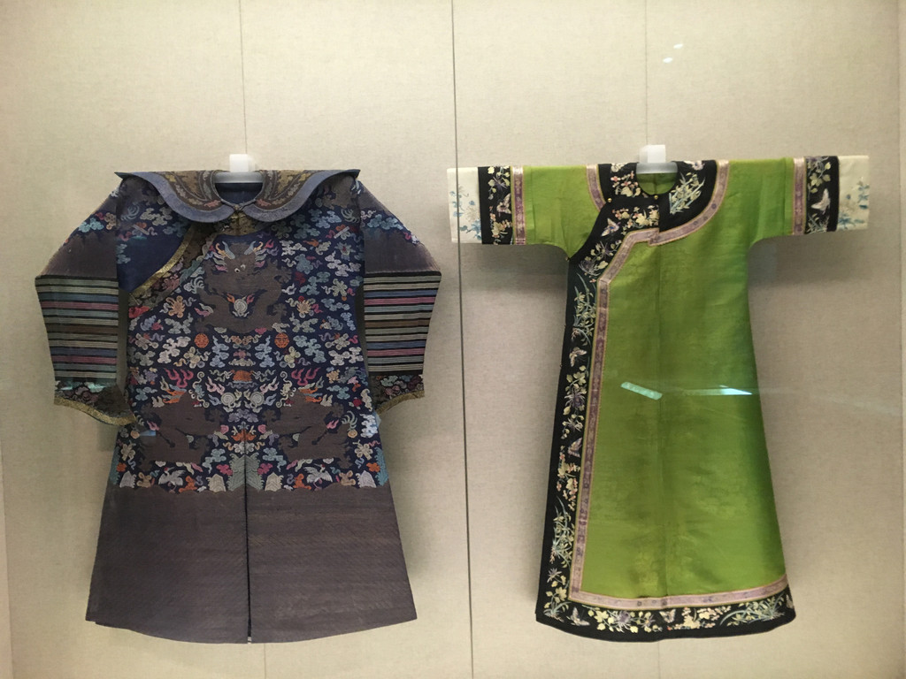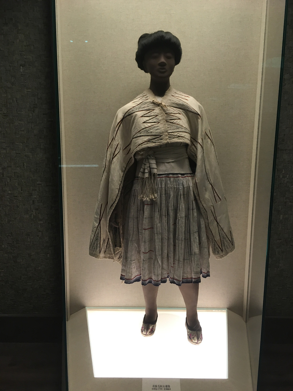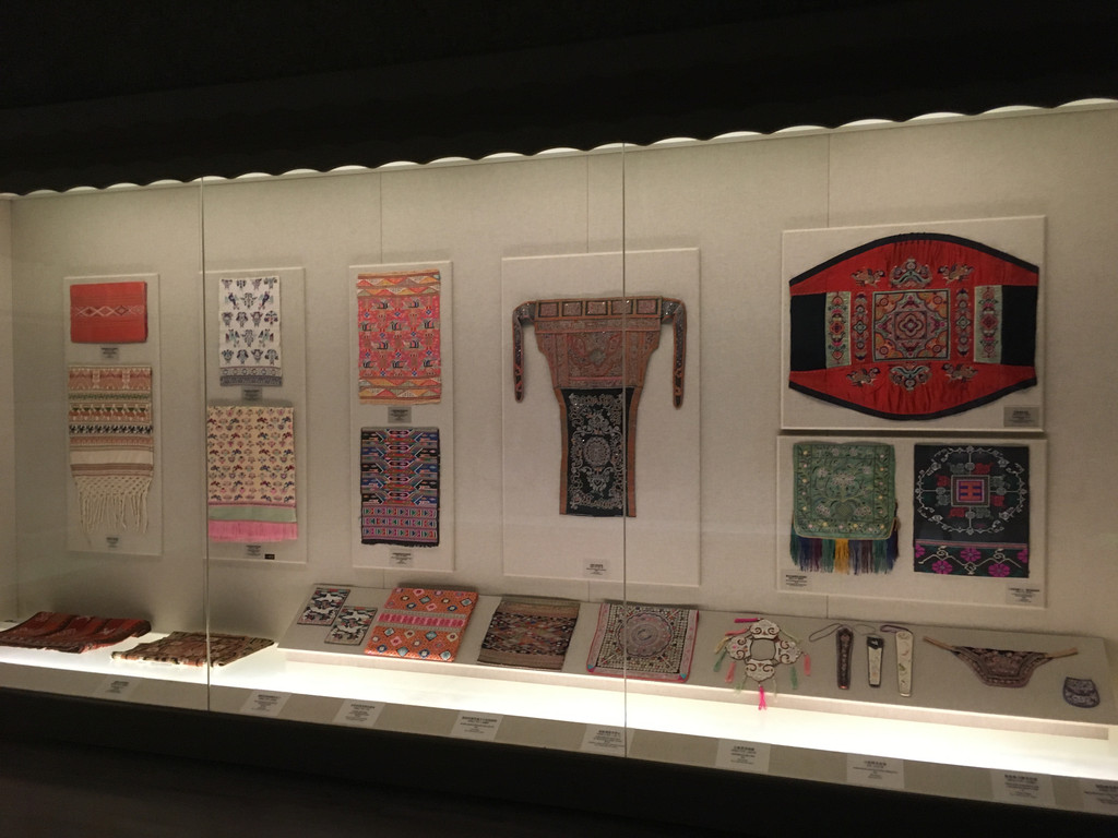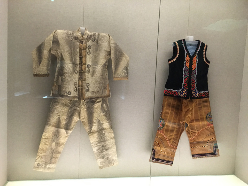 苗族也是一支古老的民族,在中国分布比较广,宗教信仰主要是自然崇拜和祖先崇拜。苗族服饰式样繁多,色彩艳丽,尤其是苗族妇女。安顺地区的苗族女盛装,上衣是交领、右衽的短衣,绣彩色花纹,下围长裙。历史上将苗族分为白苗、花苗、青苗、黑苗、红苗五支,博物馆展示的这件盛装装饰华美,花纹繁密。