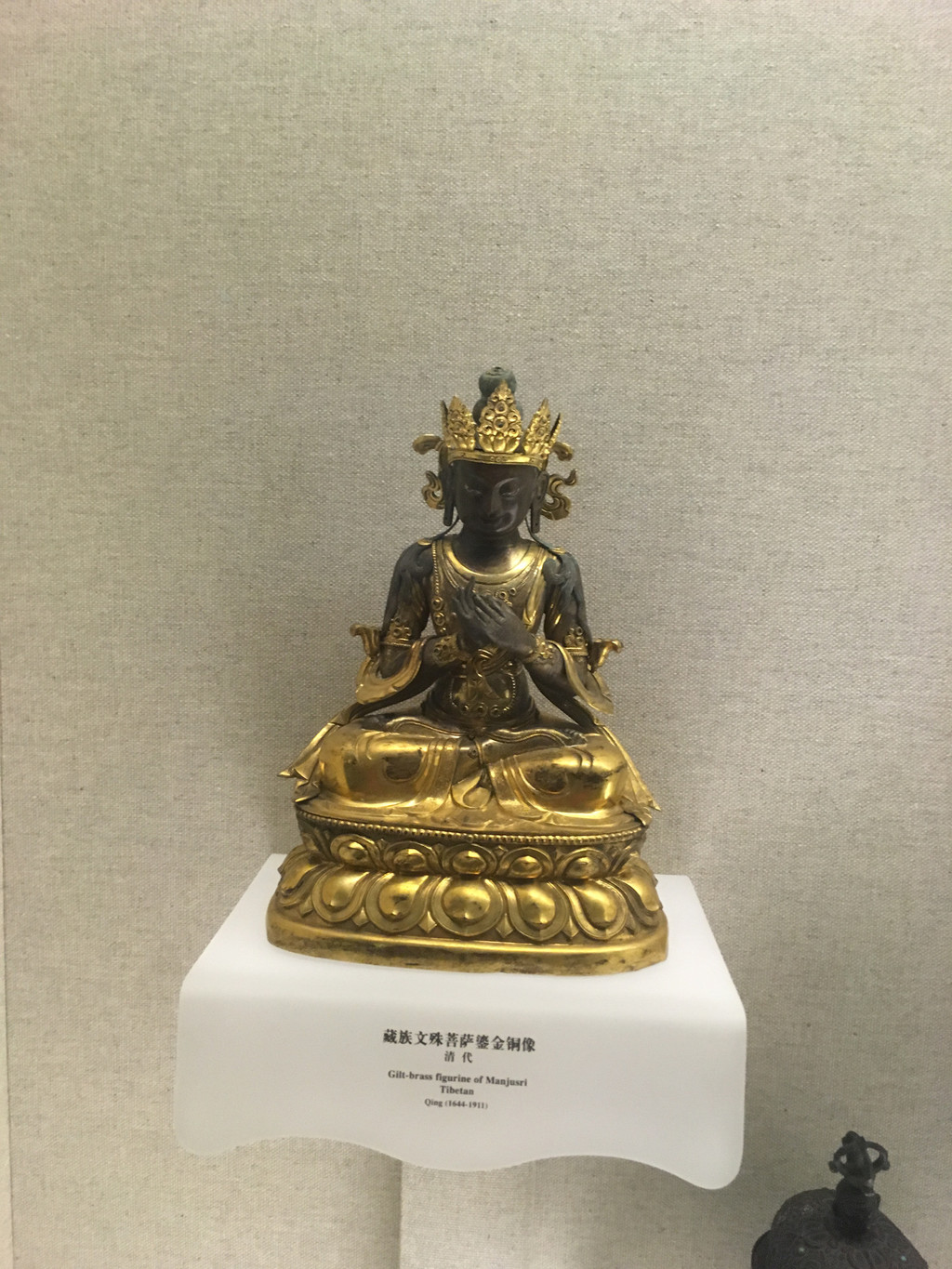 藏族的佛像也很精致,像文殊菩萨鎏金铜像就制作得十分精良,与我们汉传佛教中的文殊菩萨形态上略有差别。