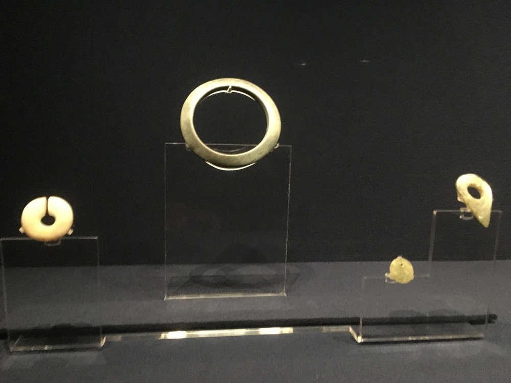项链是玉质的珠串,可能还镶了其他石头,颜色搭配很素雅,又稍有变化。珠子不像后世那样圆润,可能当时的工具难以打磨得很细腻,还露着棱角。旁边还有一件神像纹锥形器,看起来不太像装饰品,倒有点像工具。但是玉器做工具,似乎有些软……