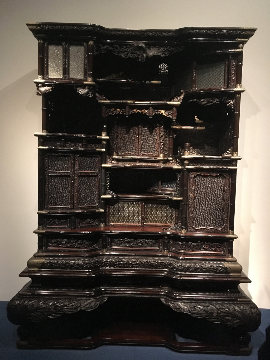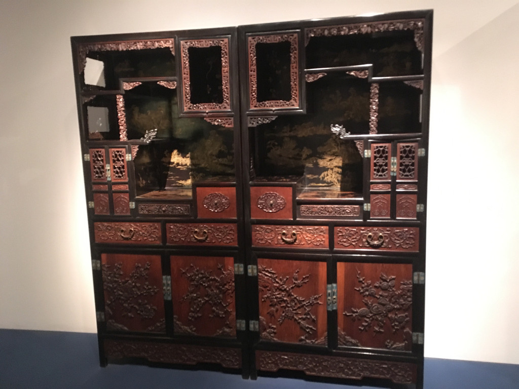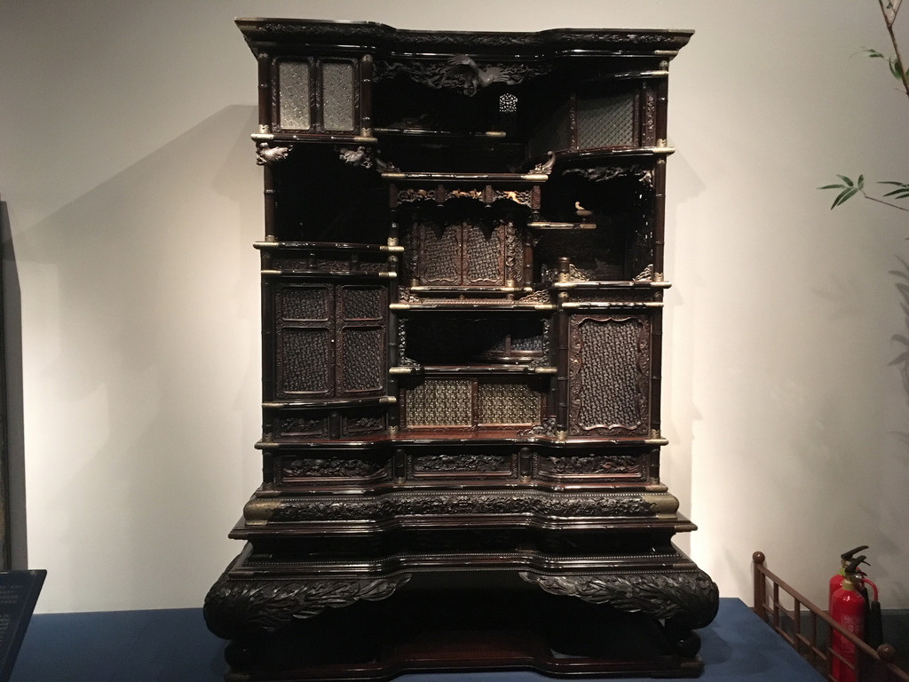 还有一件多宝格显得更加华丽,黑漆描金书柜式的,上半部分以黑漆描金山水景物为装饰,下方的抽屉脸和柜门采用鸡翅木,浮雕花卉纹。