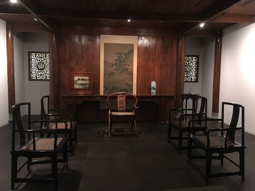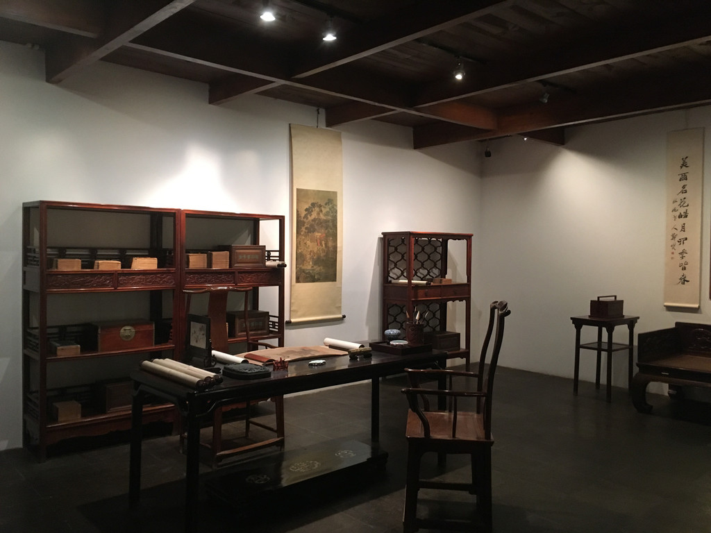 画桌前后各有一张黄花梨木四出头官帽椅,四出头的意思是指椅背搭脑两端和扶手前端的突出,这是区别于南官帽椅的主要特点。官帽椅因为形似古代官员的官帽而得名,椅背微微弯曲,和人体脊椎的弧度相符合,虽然是硬木的,但使用起来还是颇有舒适感的。当然,这里的家具是不能使用的,不过官帽椅在明代很盛行,现在很多旅游景点都有这种椅子,复制品还是可以坐一下的。
