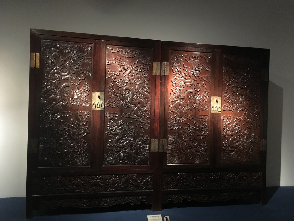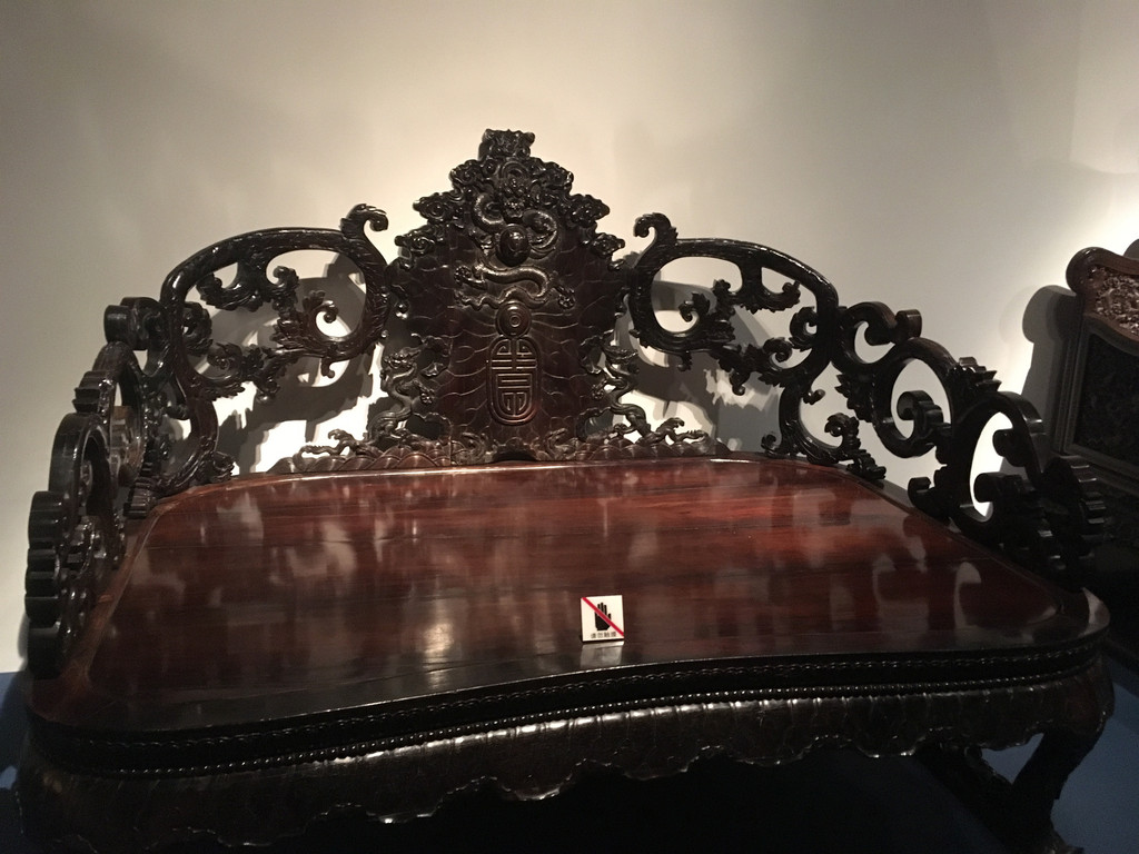 紫檀木仿竹节雕鸟纹多宝格很是精美,兼有西洋风格,使用了西洋彩色压花玻璃,雕刻又是东方传统纹饰,雕刻竹节纹边框。柜顶居中的凤凰雕刻,据说头部可以转动。可惜这种珍贵的文物,是不可能让游客上手的。