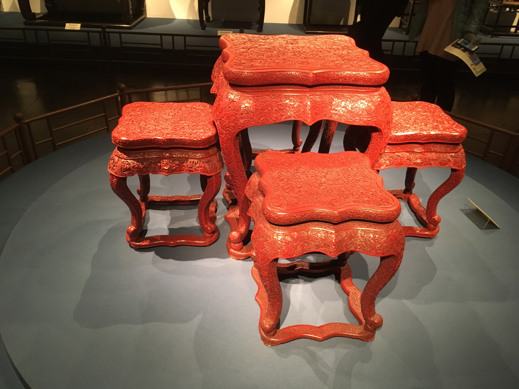 清朝的剔红花卉纹三弯腿方桌、凳由一张方桌和四个方凳组成,都是三弯腿的式样,桌面和凳面以及托泥都作四瓣花形,式样很美观。剔红是漆器的著名工艺品种之一,制作精良。