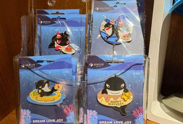 哈哈,开玩笑啦,其实还蛮划算的。我入了这套站肩小虎鲸,一大一小,内里有牵绳的吸铁石,从衣服内侧一穿而过,虎鲸就能在肩上站起来了。当作衣服装饰也太特别了。