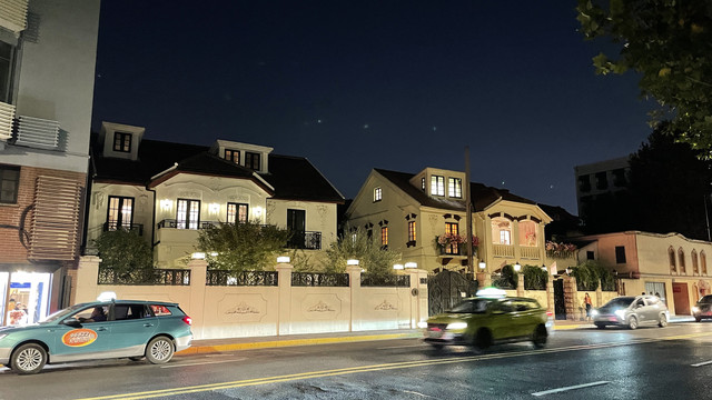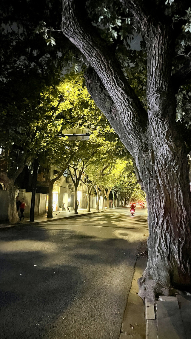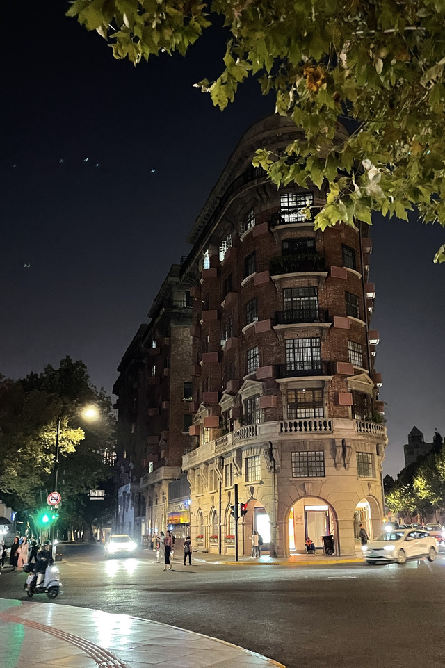 除了武康大楼之外,两旁的道路也有许多独特又历史悠久的大楼。夜色之中也独有一番风味,倘若是白天,阳光透过梧桐树叶洒落在街道上,想必更加迷人。