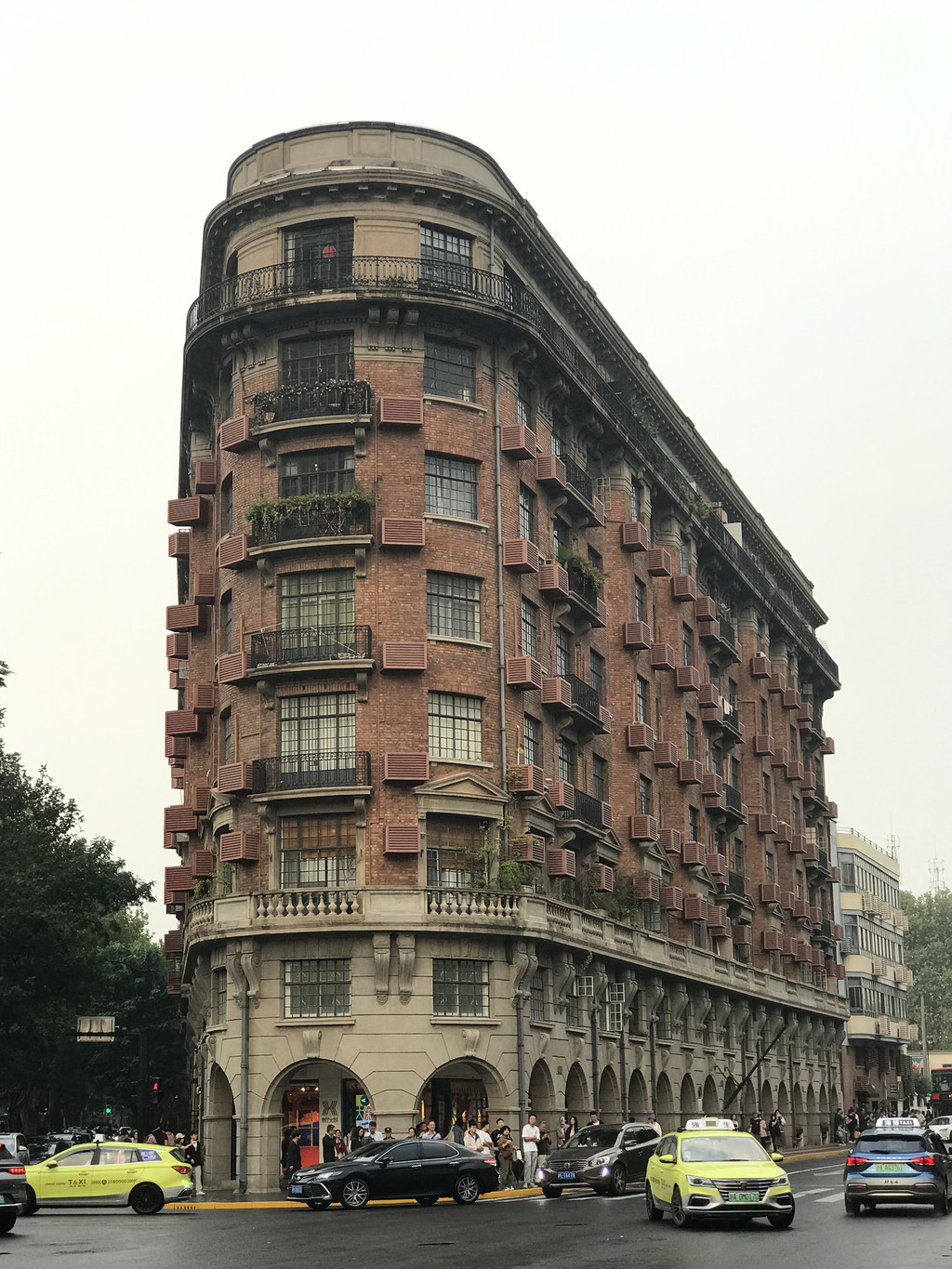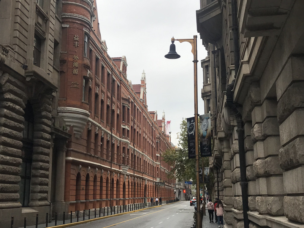 路口的武康大楼是武康路的标志性建筑,是拍照打卡的热门。我们从路口几个方向不同角度,围着武康大楼拍了一圈,又走进一层的长廊,仔细欣赏这一历史名建。外立面的红色墙体,三角形的窗楣,铁栅栏的小阳台,浓郁的法国文艺复兴风格;大楼底层为东南亚风格常见的骑楼样式,长廊可以行走,开了一些小商铺;整体造型宛如一艘等待起航的巨大游轮。