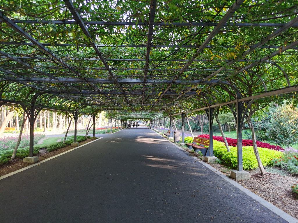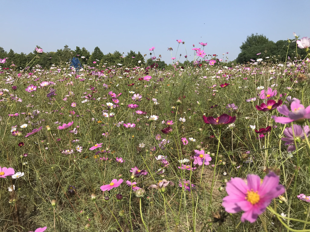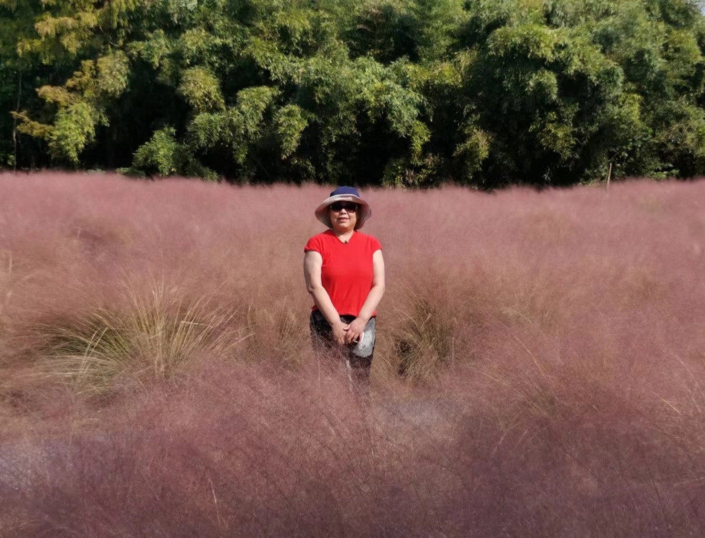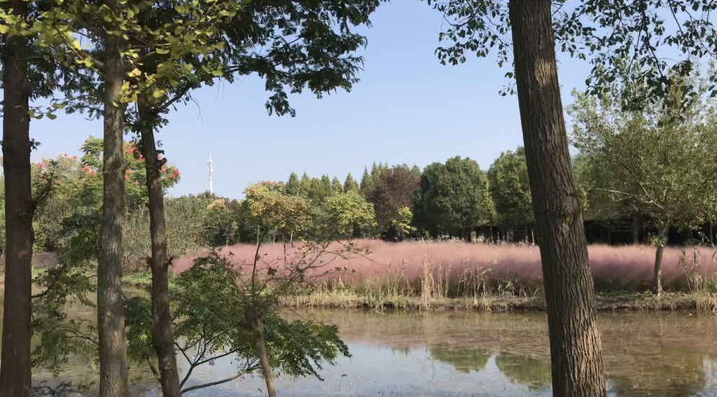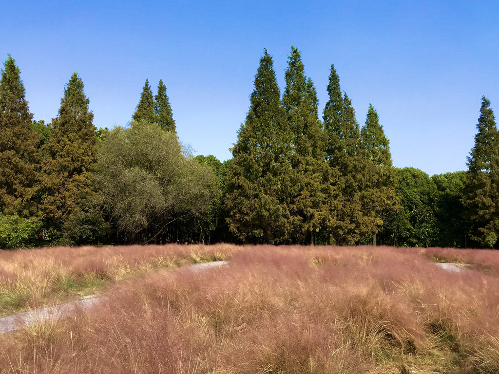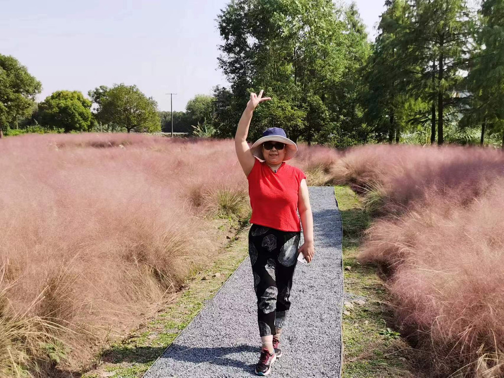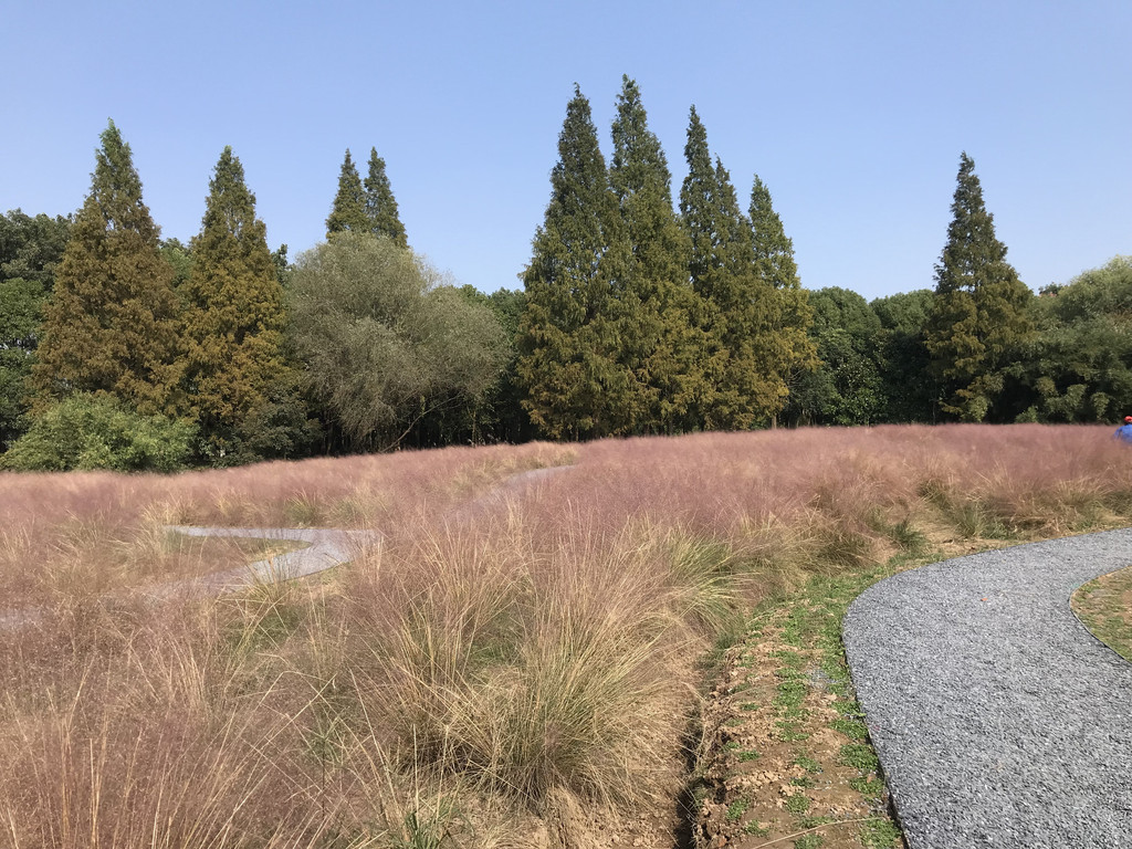 我们在离大门最近的一个电瓶车停靠点下了车,先扎进粉黛草中拍照。粉黛草,近几年在几个公园景区见到过,这里成气候的一大片还是让我们禁不住扎进丛中各种摆拍。绿意盎然中,粉色总是会给照片带来惊艳。