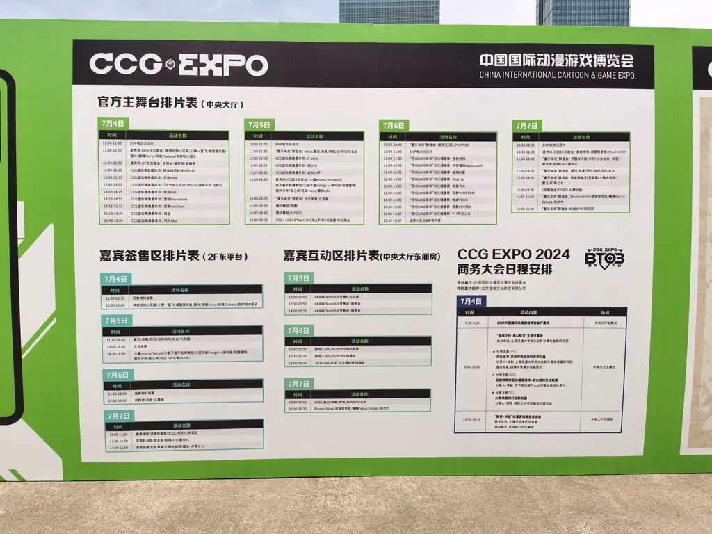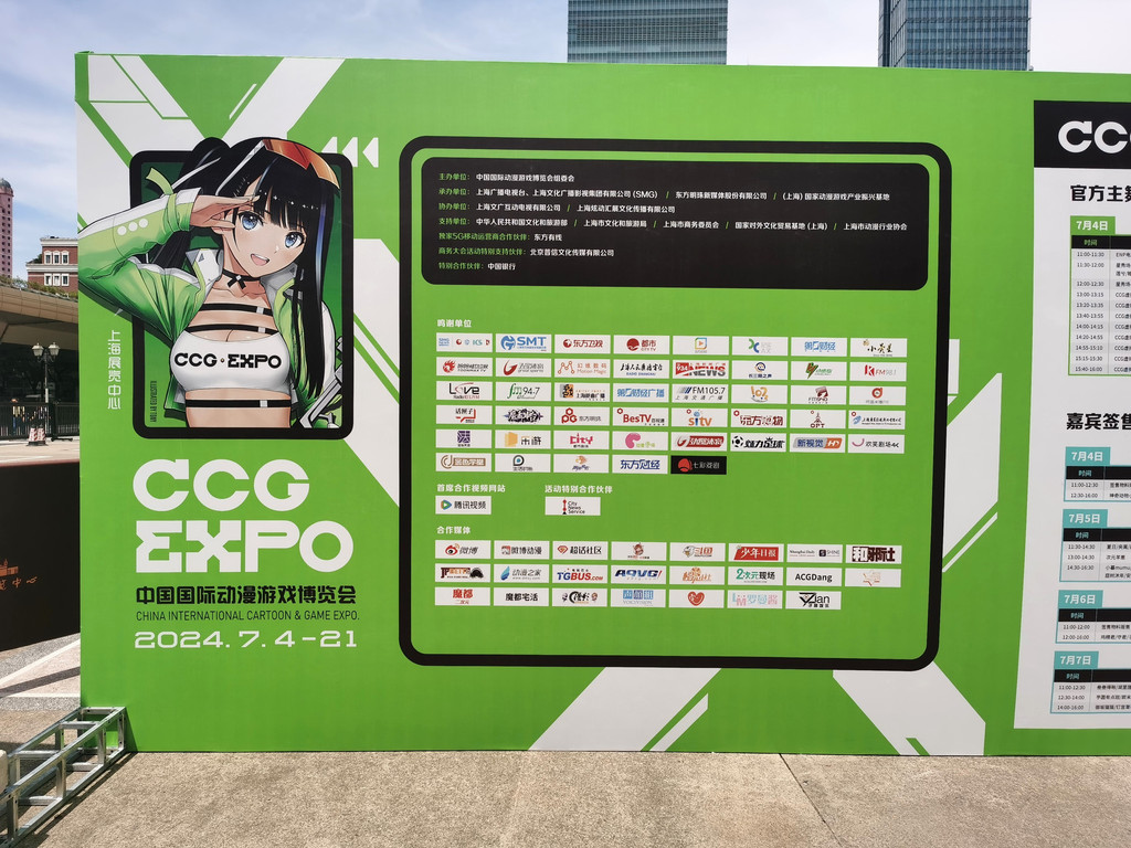 自从2005年开始,原国务院文化部(今文化和旅游部)与上海市政府一起举办中国国际动漫游戏博览会(即CCG EXPO)。2024年7月4日开始,CCG EXPO 2024将重回首届CCG举办场地——上海展览中心开幕,场内相关活动在7月7日结束。随后还将从7月7日至7月21日这两周时间联动魔都南京路步行街、人民广场等地举行热闹的场外活动。