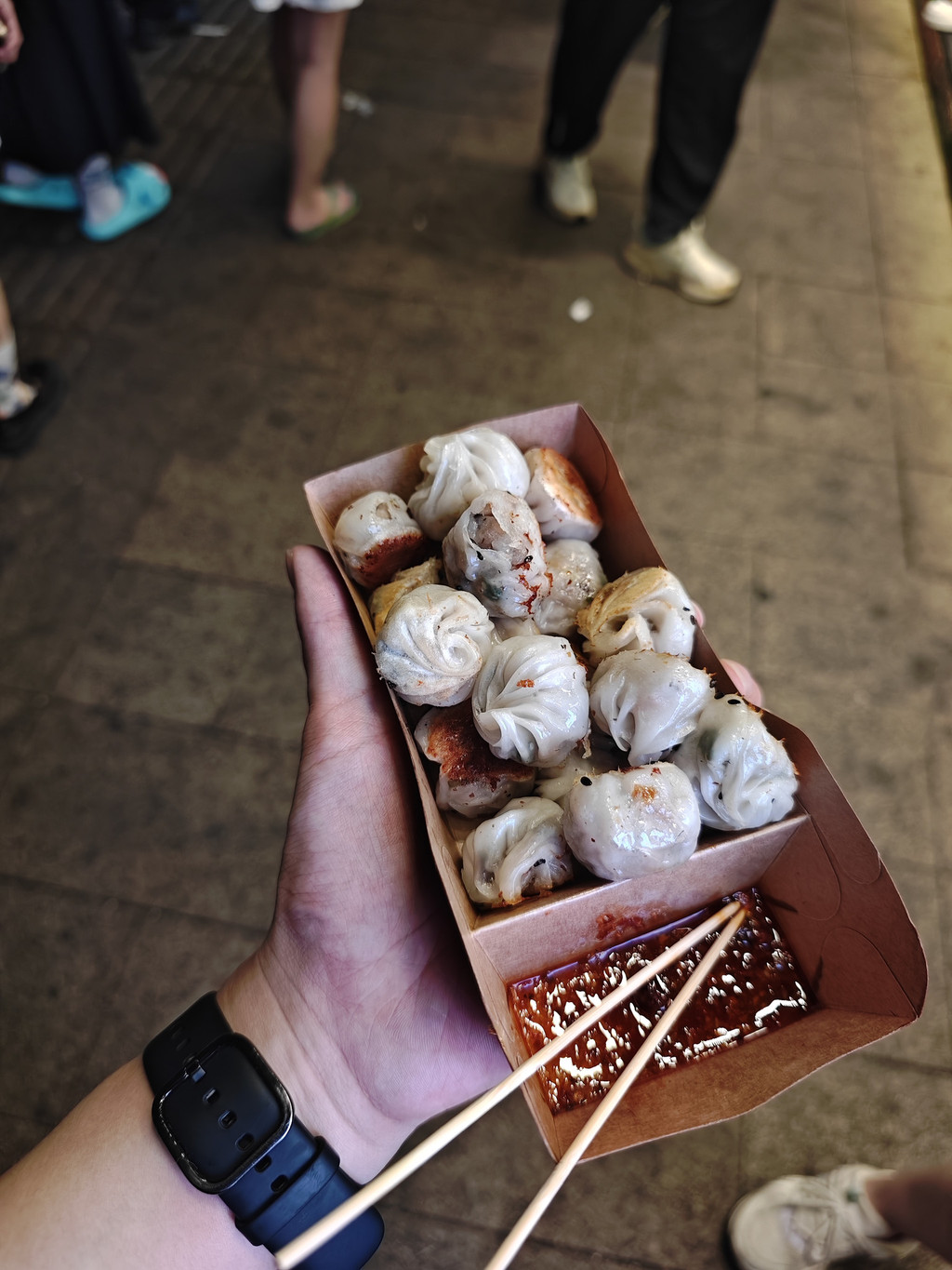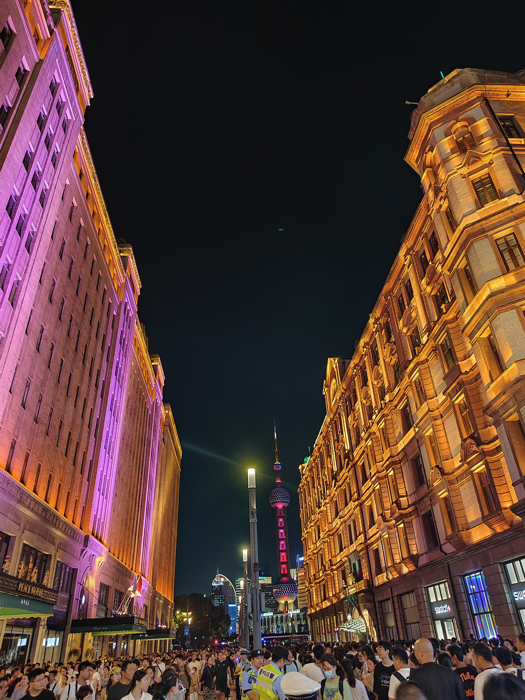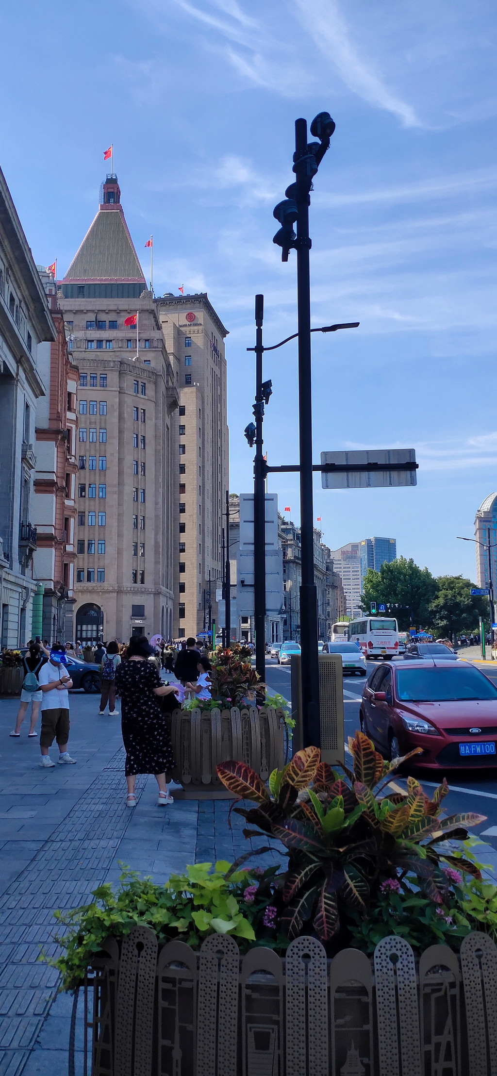 沿着南京东路步行街,我们边走边逛,两边高楼林立,繁华商圈,警察维持着秩序,走着走着就看见了东方明珠,不少人还驻足拍照,此时已经可以用人挨人来形容了。正好沿途有小吃城,也不管是否贵,买了一份拇指生煎,贼好吃,入口的味道令人难忘。里面还有其他生煎,小笼包,我们各自尝了些,还真不错。买个上海老酸奶,味道和小时候吃的差不多。吃完继续随着人群往外滩方向挪,终于过了马路就到了。回望刚才的路边,才发现就是万国大厦群,我们在马路边取景,拍了一些照片。