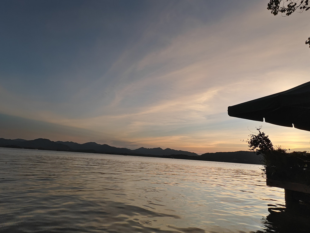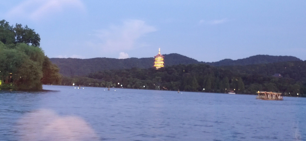 吃饱喝足,就决定去西湖边逛逛。传过西湖步行街,两边有银泰西湖店,人流如织,繁华,但是真热!到了西湖边才六点多,很多人排队进一个地方,有栏杆那种,我就问了下工作人员,他们说这是看音乐喷泉的地方,于是我们也就排队进去了,还安检了一下。不过,在湖边待不住,太热了,汗直流。我又问工作人员几点喷泉,告知七点半,那还一个多小时呢,在这不得热死,还不如先去坐船游览一下。因此我又走出去,孩子此时自己玩去了,我就沿着西湖溜达,去找码头。在不远的地方就有很多人排队乘船,有不同的游船,价格都是五十,但是有龙头的大船,也有普通船,有两层的,也有一层的,看哪个有船就排队坐即可。本来我要孩子赶回来跟我一起,不过他的方向和我正好相反,于是我就自己买票登船,是个龙头豪华两层的船,一层是有窗户和空调的,二层是视野好四面透风的。我当然选择了一层,凉快,大玻璃还很清楚。而且我上船后就开船了,一层加上我才不过七八个人,估计其他游客都在二层呢。游船全程四十分钟吧,绕着西湖转一圈,看到保俶塔,雷峰塔,灵隐寺等,远观,近看,不同角度拍照都很好,夜幕降临,荡舟湖上,别提多惬意了!