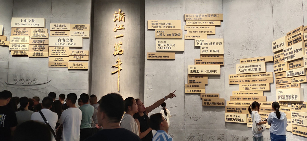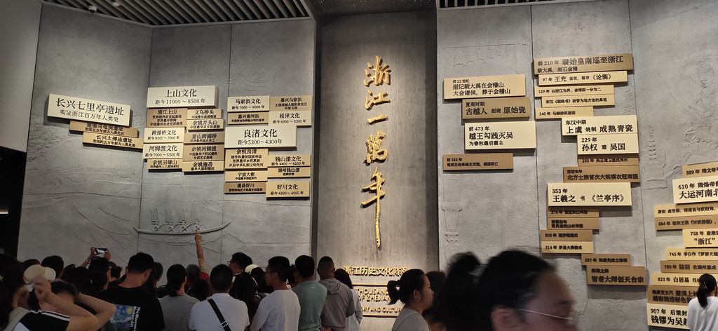 大约九点多进馆,里面好大啊,凉快,视野好,一层大厅有浙江历史展馆A馆,和临时展览,地下还有一层临时展览,我们主要去了浙江历史展馆,,从史前一直到解放后,把浙江历史的发展讲述的非常全面细致,建议有时间的可以租下讲解,慢慢听。我们因为时间不够,就没租讲解,自己转的。每一层都有文创展品的售卖机,有徽章,大概35元吧。在一层进门右手边是文创商店,如果买了集章册,可以在后续各场馆里集章,买册子要58元左右,后面盖章是免费。