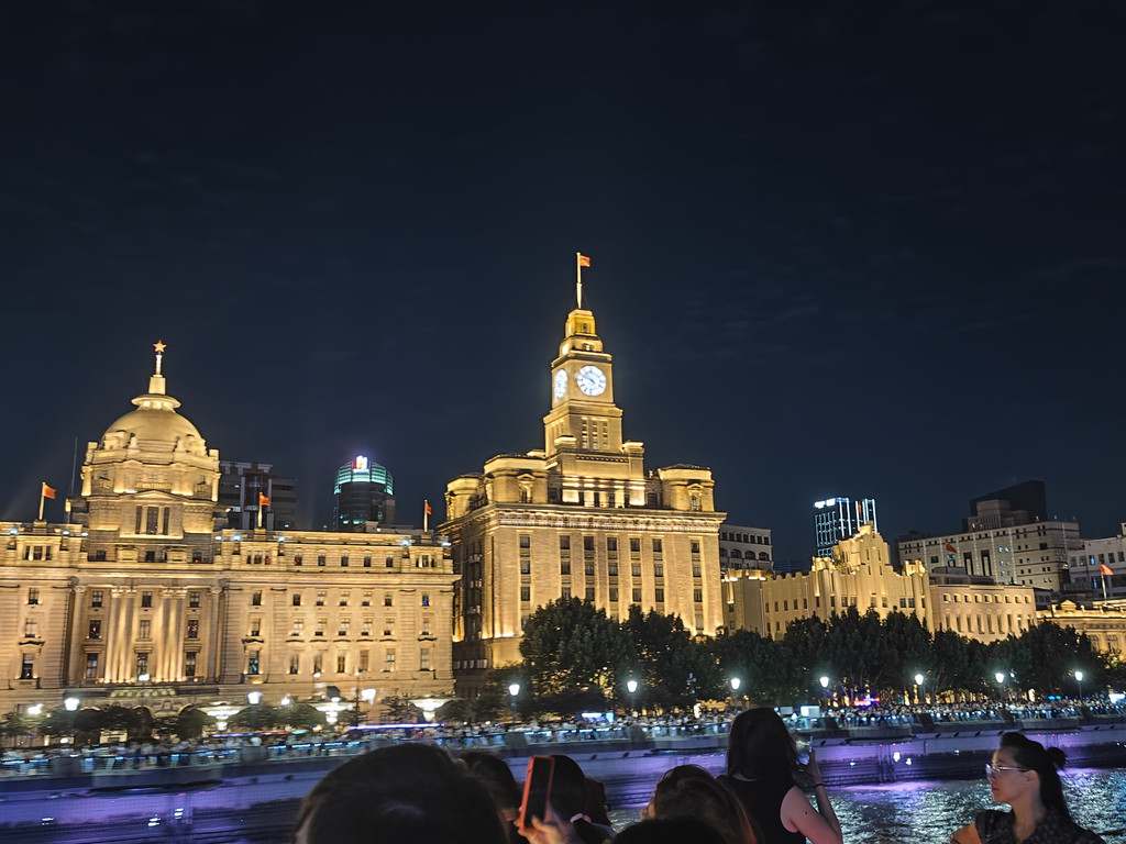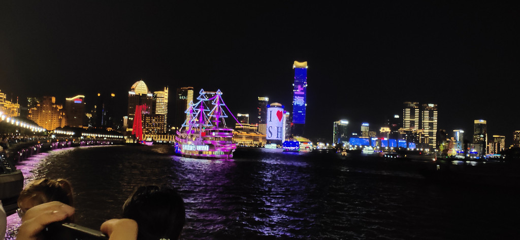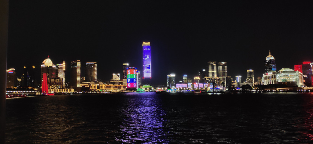 现在想去外滩江边看看,但是因为人群集中,要继续向前爬一些楼梯才能看见江水。不过随着人群走就行。好不容易上来啦!看着黄浦江水从眼前流过,一艘艘游船缓慢驶过,如做梦一般。不过,最抢眼的还是对岸的陆家嘴建筑群,东方明珠、陆家嘴三件套等,华灯闪耀,美轮美奂。在江边倚靠栏杆,狂拍一气,然后开始找游船,夜游黄浦江。