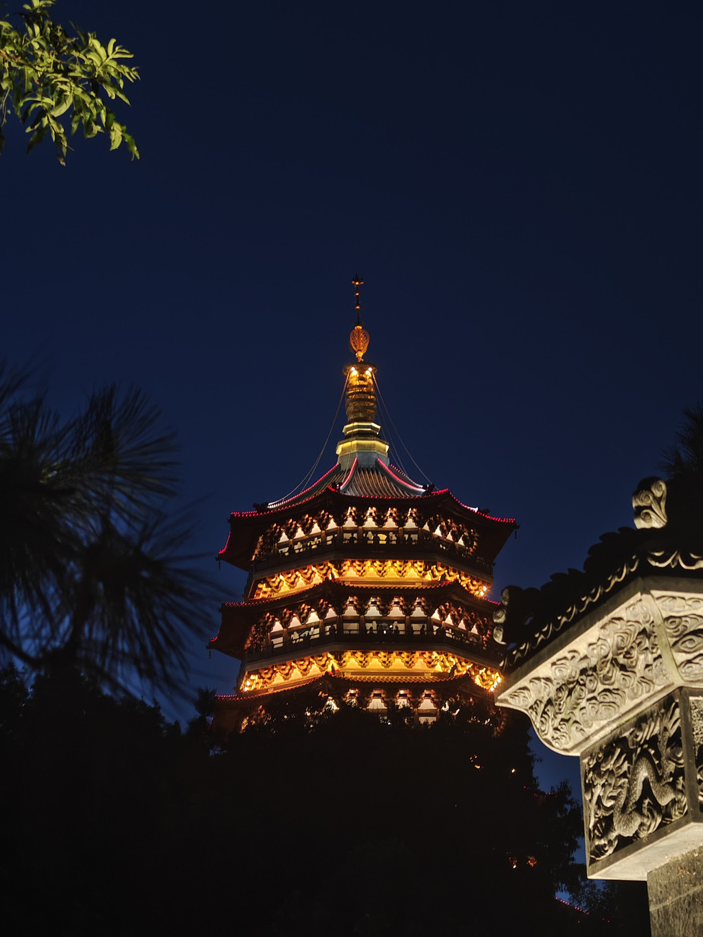 打车回酒店休息。到了酒店,孩子就不想动了,可是这时才四五点,不出去逛岂不是浪费。我把手机充满电,又鼓励他继续出去转转,比如看看雷锋塔的夜景,于是我们快七点了又出去转。打车去雷峰塔,结果是工作日,路上比较堵,到了雷峰塔天都黑了,人家7:30就停止入园,我们到的时候还剩几分钟就不让进了,所以在门口看看就没进去。而雷峰塔这个景区往两侧走才能到西湖边,所以我们沿着一个方向走,希望能到西湖边看看夜景。结果方向选的不好,越走人越少,路边都看不到车了,而且湖边也没人,码头更找不到了。摸着黑沿着湖边走,居然看到了不一样的雷峰塔夜景,灯光漂亮,三潭映月的景物也清晰可见,月光如水,微微风起,波涛踊跃,拍打着岸边,哗哗的声音入耳动听。如果不是因为赶路,我很想坐西湖边看看这夜景。