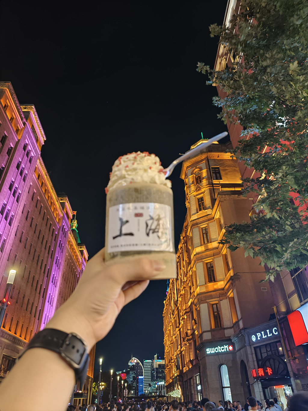 在入住后,简单收拾了一下,就决定出去逛逛外滩,寻觅吃喝玩。回想刚才来的路上很热,就决定打车去外滩吧,没多少钱,还能省点力气,于是叫了个滴滴,去外滩。走到南京东路附近,已经走不动了,于是下车,开始跟着人流蠕动。见到街边有感兴趣的店,就进去逛逛。看见好喝的就买了尝尝,好吃的就买了吃吃。本来想吃个蟹黄面套餐,但是预想的店和我们走的方向没对上,所以先不吃了,路上看着买。