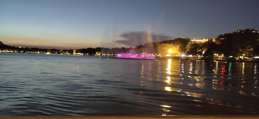 更有性价比的是,本船快返回出发点时,音乐喷泉开始喷了,我们在湖面上远远的看,非常清楚,相比岸上的人山人海,我们的视野和角度正好,感谢自己坐了船,这个决定太好了!我们的船为了让游客好好看看,在距离岸边不远处停了一会,大家有机会多看看,此时二层不少游客也陆续下来一层,共同惊呼。
