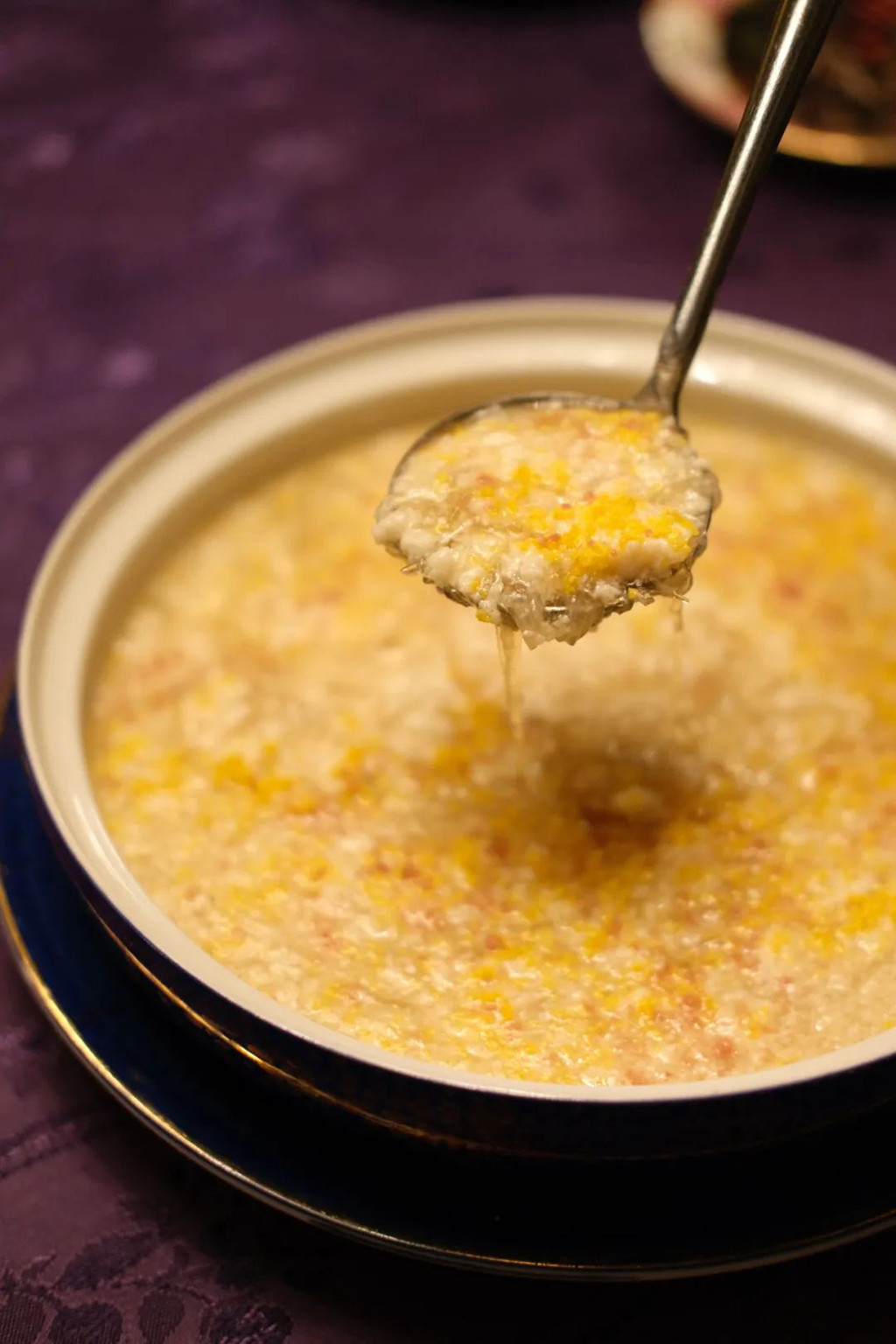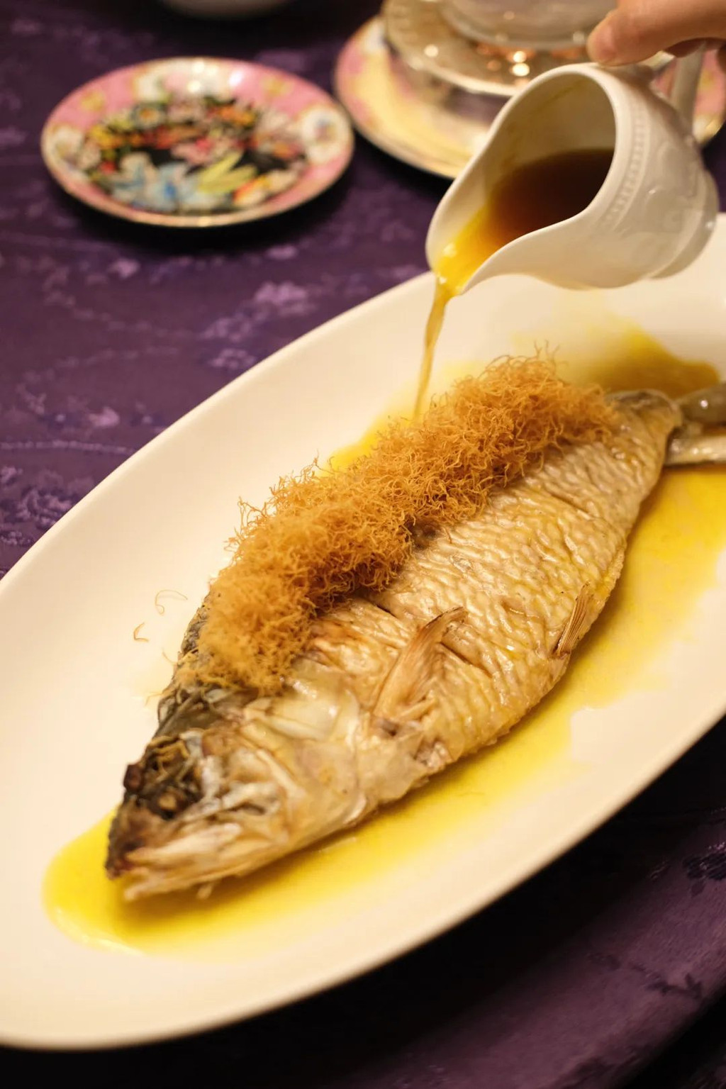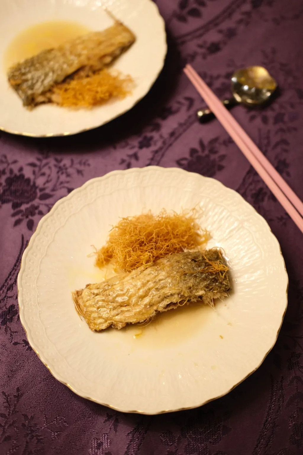 这道菜我认为比普通的酒酿蒸鲥鱼更好吃,鱼鳞最好吃,抿一抿脂肪,像日本鲷鱼的立鳞烧一样,口感是我从来没吃过的。它实际也是“一干一湿”的呼应。