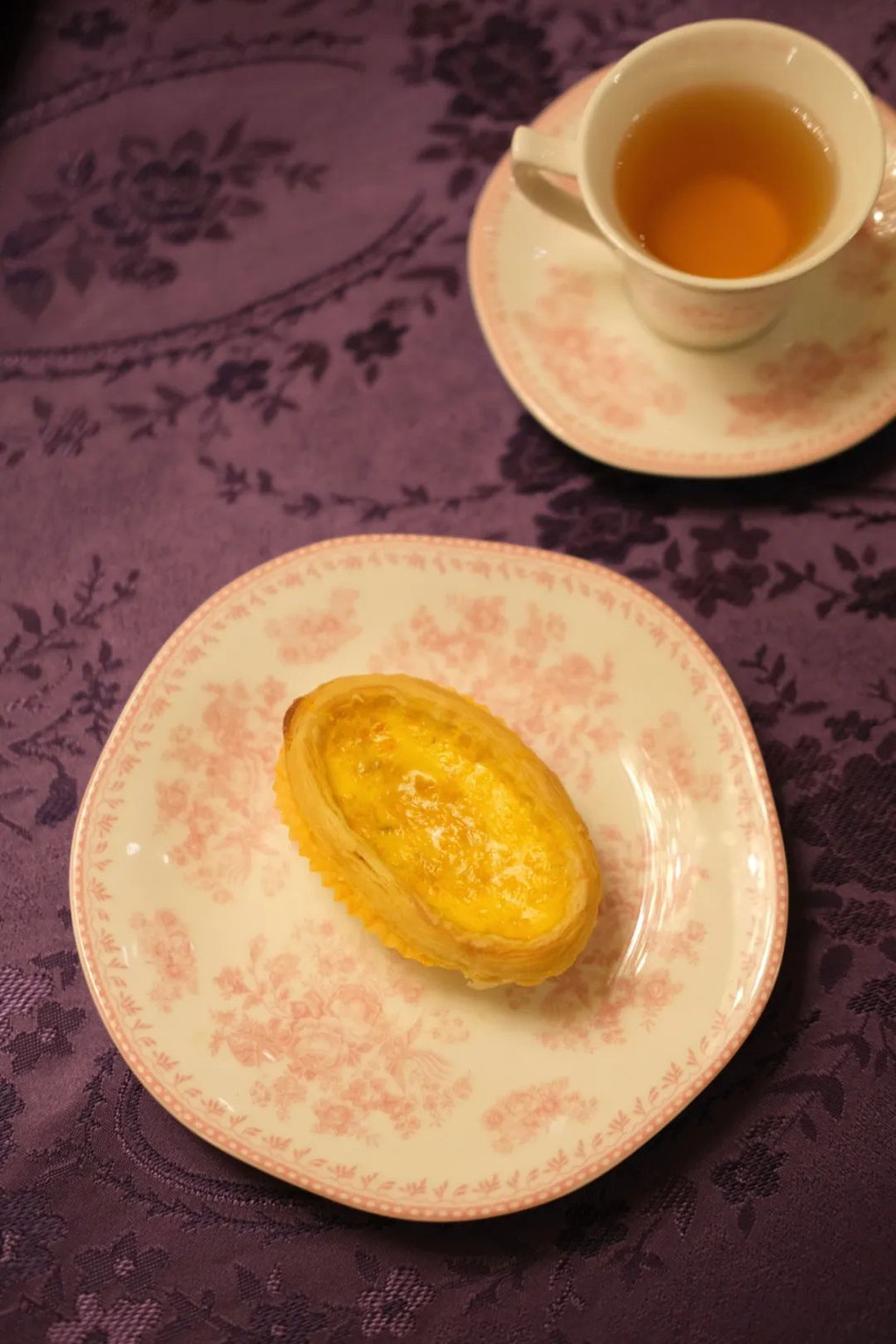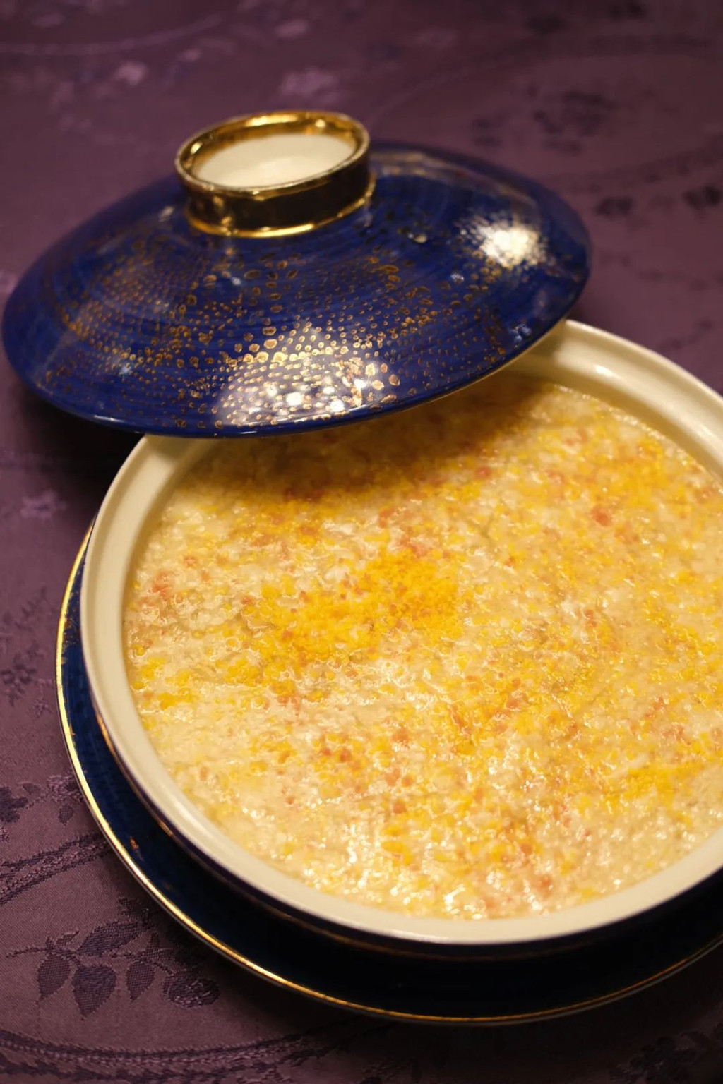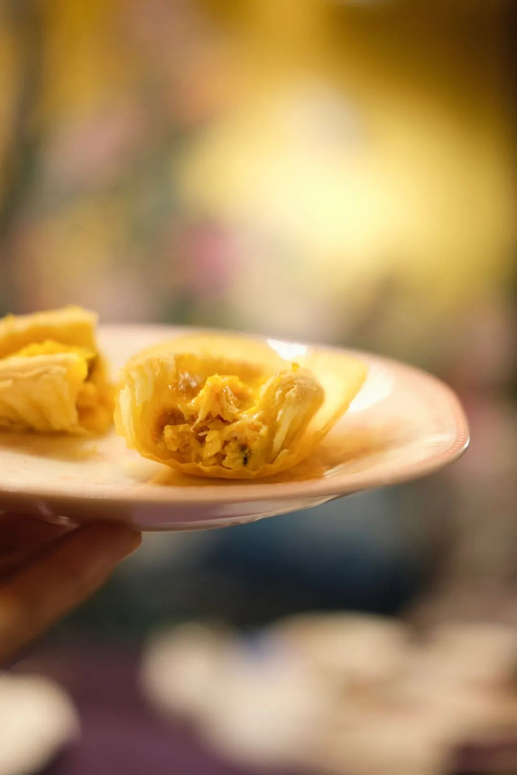 伍先生多次提到“一干一湿“,包括咸的蟹粉蛋挞也是这样。我第一次吃到时,蛋挞这座丰碑式的甜蜜记忆,随挞皮悉悉嗦嗦崩裂了,咸鲜滚烫的蟹粉味道扑舌而来。如果说,咸甜交织的叉烧挞是挞类的味觉“破冰”,那这次千层酥皮、蛋和蟹粉的亲密接触,让我对挞的陈旧印象彻底破圈。