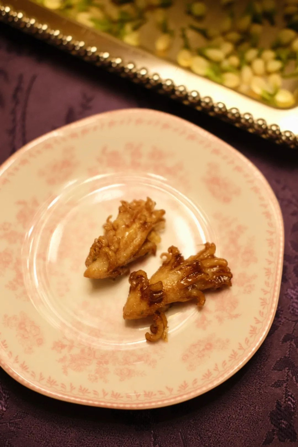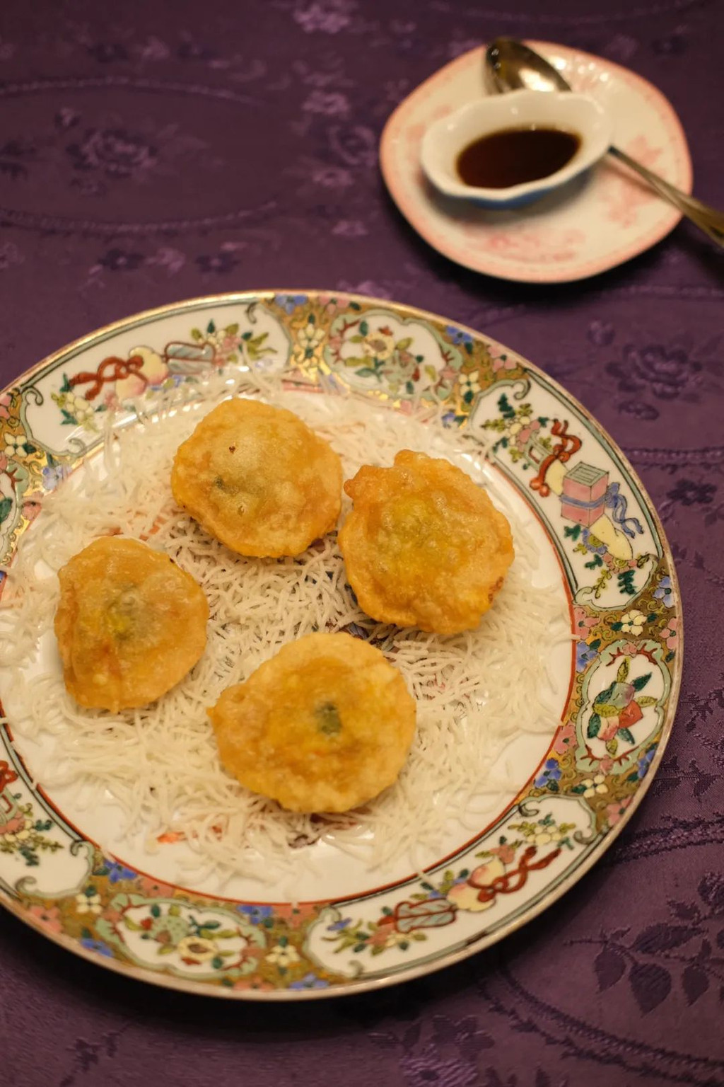 这道菜我在沈爷的精妙文字里“吃”过。茉莉鱿鱼卷是基于传统梅龙镇酒家的基础上制作的,在一盘菜里面,品尝了茉莉花的几种形态。丝状的茉莉花,油炸过的茉莉花,包括鱿鱼都是茉莉花的形状。