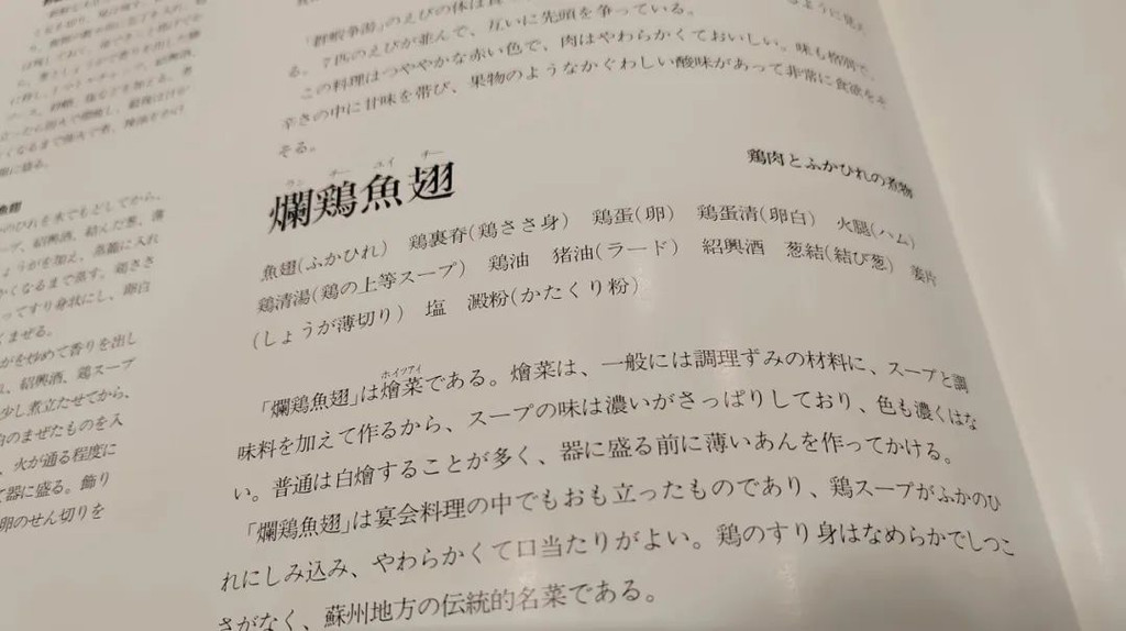 78年改革开放,当时驻日大使告诉伍先生,如果去日本,就一定要去这家店看看,伍先生就记住了这件事情。之后查询资料时发现79年到81年,大约两三年的时间里,他们制作了10本《中国名菜》,由日本妇女之友出版社出版,其中北京、四川、上海各有两本。伍先生当时直接在日本购买,一套4800。目前这套书的价格不止这个,48000都买不到成套。这套书里拍摄了很多珍贵的中国老菜品,这道“烂鸡鱼翅”就在其中。伍先生后来发现,1930年这道菜就出现在陆羽居的茶点单子中。