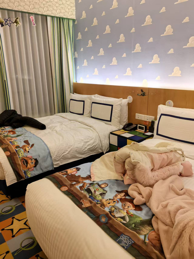 第二天:玩具总动员酒店到迪士尼乐园最早一班车是6:55,因为看过攻略,说要6:30左右排队才能赶上第一班车,所以早晨6:00就起床了,洗漱完毕到楼下大概是6:35,此时队伍已经拐了三个弯了。排了大概15分钟,来了第一辆车,我们没上去。大概过了5分钟,来了第二辆车,终于挤上去了。酒店的车把我们送到一个专门的入口,进去之后,狂奔到小矮人矿山车,然后是飞跃地平线,然后是疯狂动物城。基本都不排队直接就能上的那种。三个热门项目结束时才8点多一点,然后去了加勒比海盗,结果设备坏了,要等通知。本来打算去创极速光轮的,但是因为小矮人矿山车就已经感觉很刺激了,就放弃尝试这个,剩下的时间就是慢慢逛了。在刚入园的时候预约了10:30的米奇秒游童话书,这个舞台剧还挺不错,基本把迪士尼所有的动画片都过了一遍。下午3:00逛得差不多了,室外也挺冷的,孩子对晚上的烟花不感兴趣,我们就出了园,去行李寄存处领取了行李,坐地铁到了南京路上的金八仙酒店入住。这个酒店真是宝藏酒店,交通方便,设施先进,价格便宜,吃饭也很方便,两晚一共700元左右。