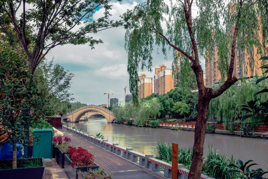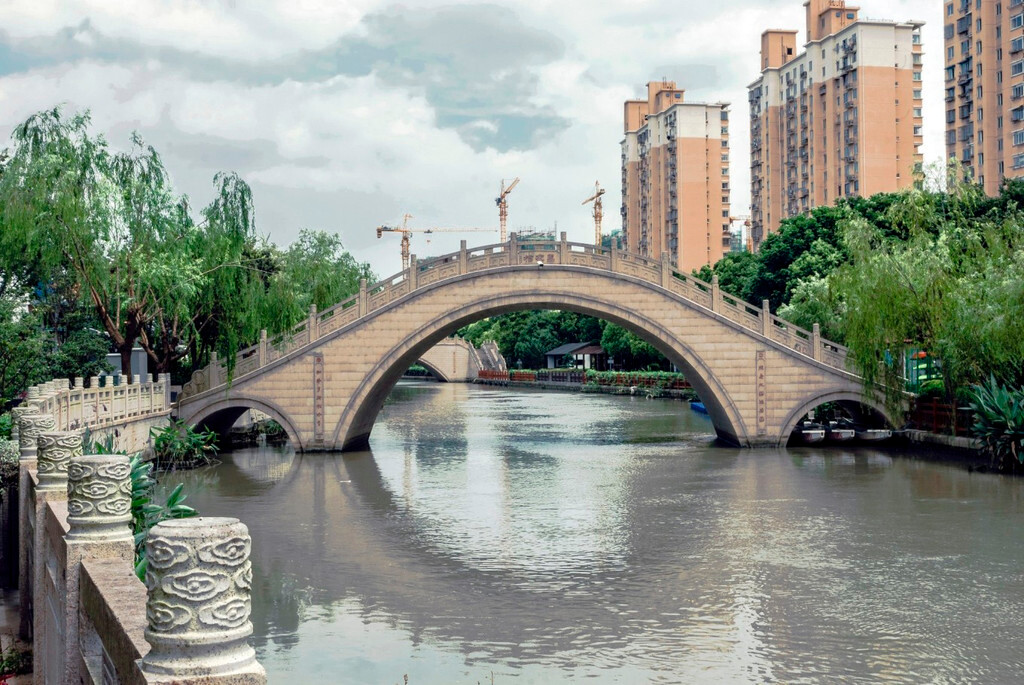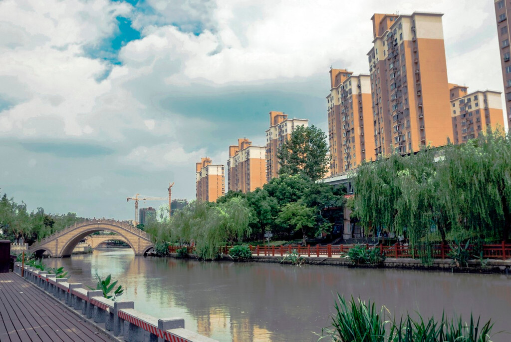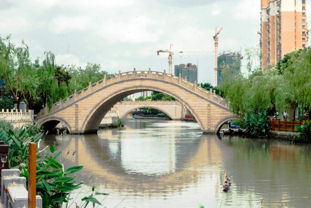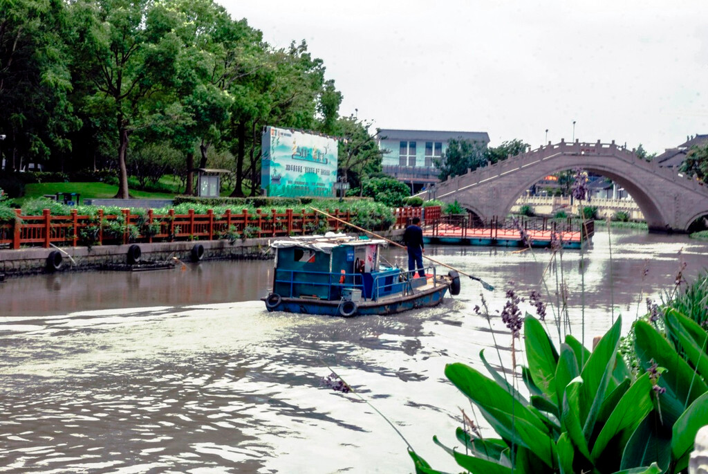 柔软的柳条轻拂,远远望去,三林塘俨然一座漂浮在水上的古镇,站在桥上,可以俯瞰整个老街街景,小桥、流水、人家……枕河而居的老街宛如在画中。