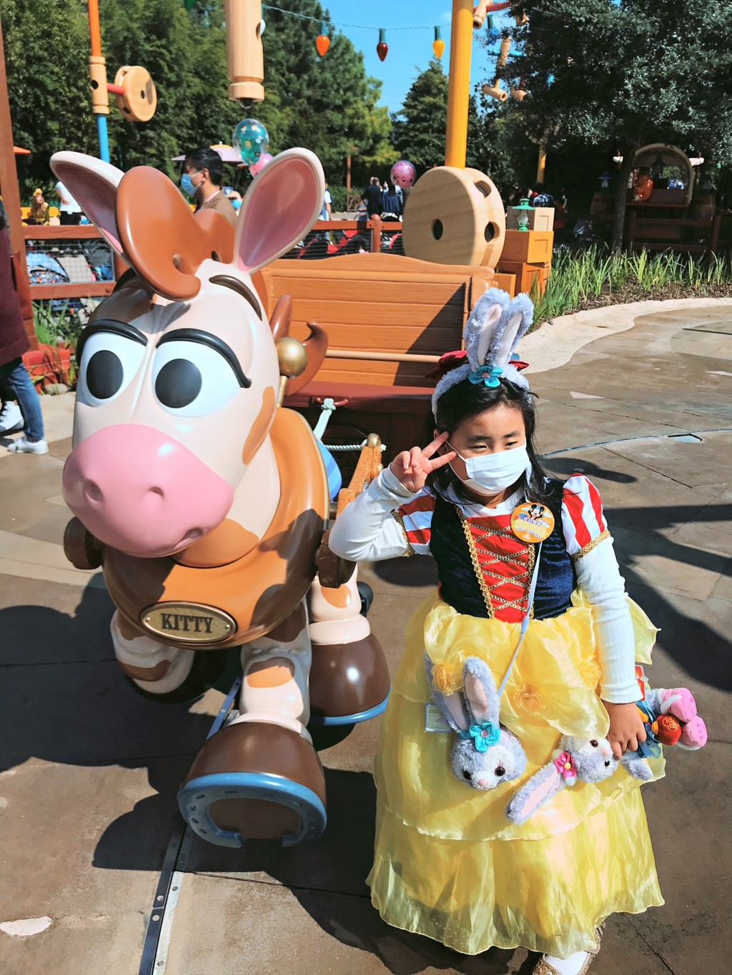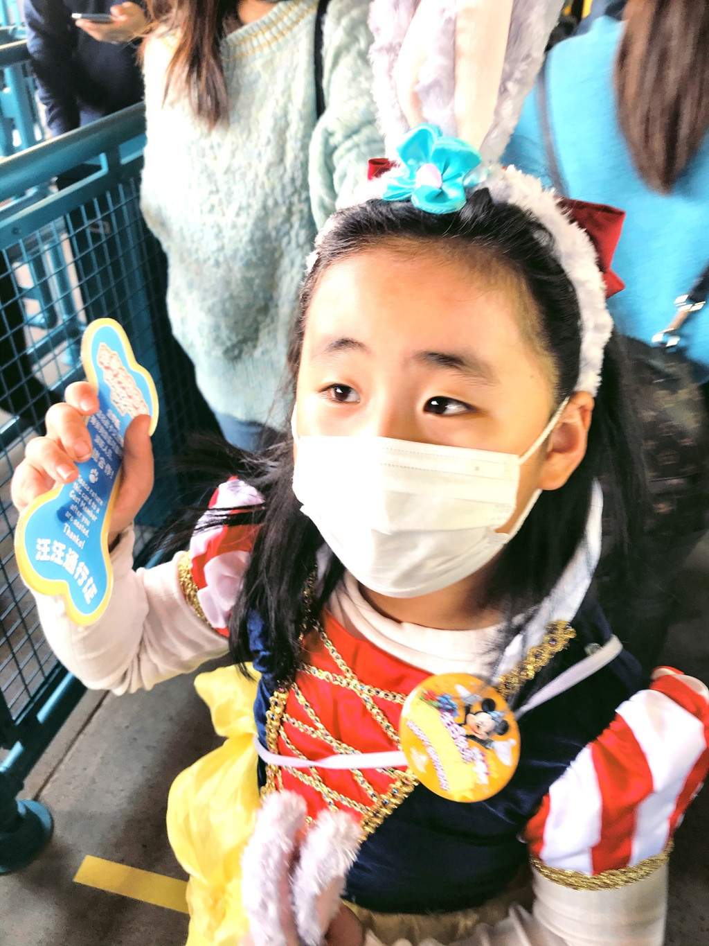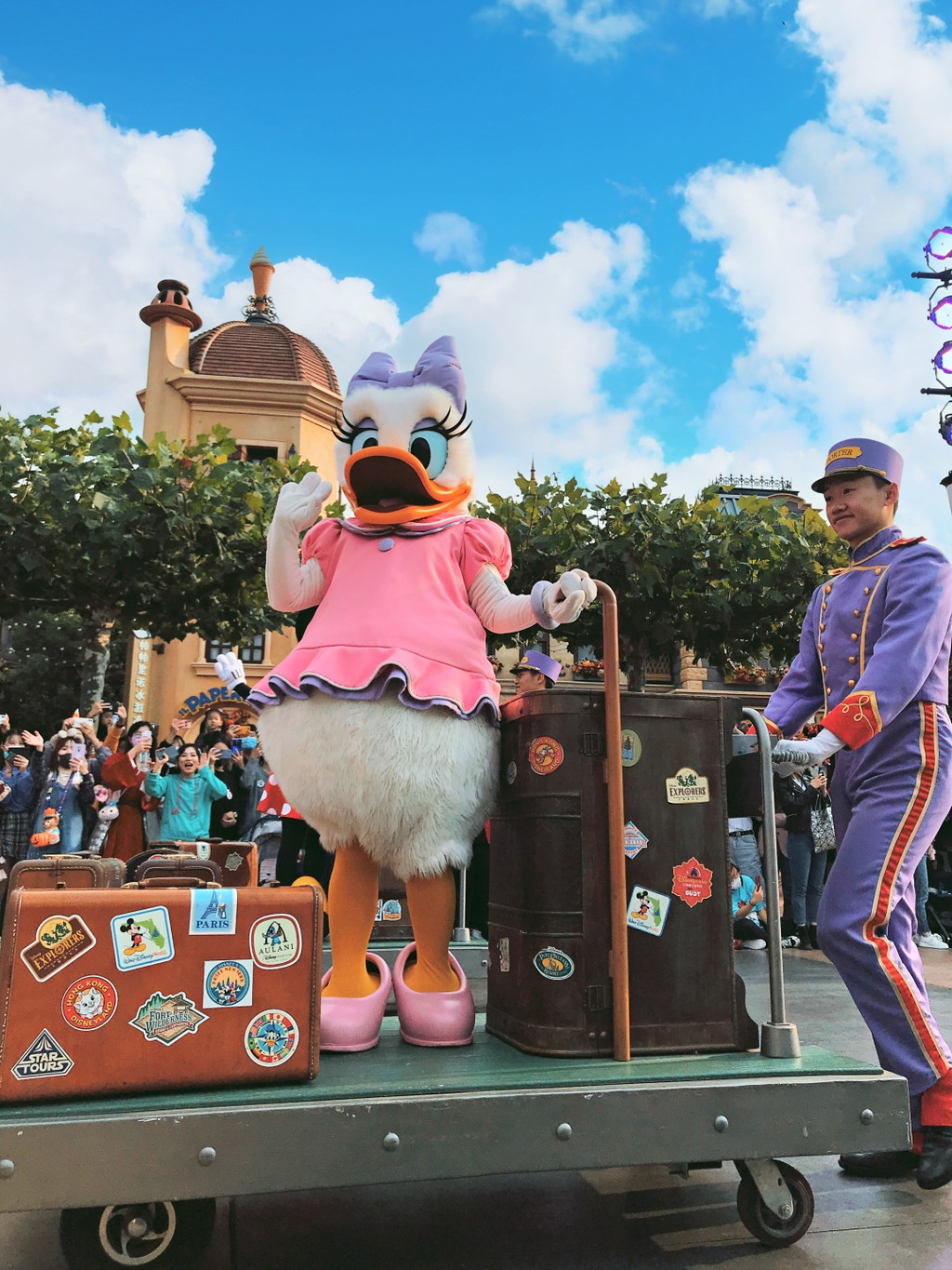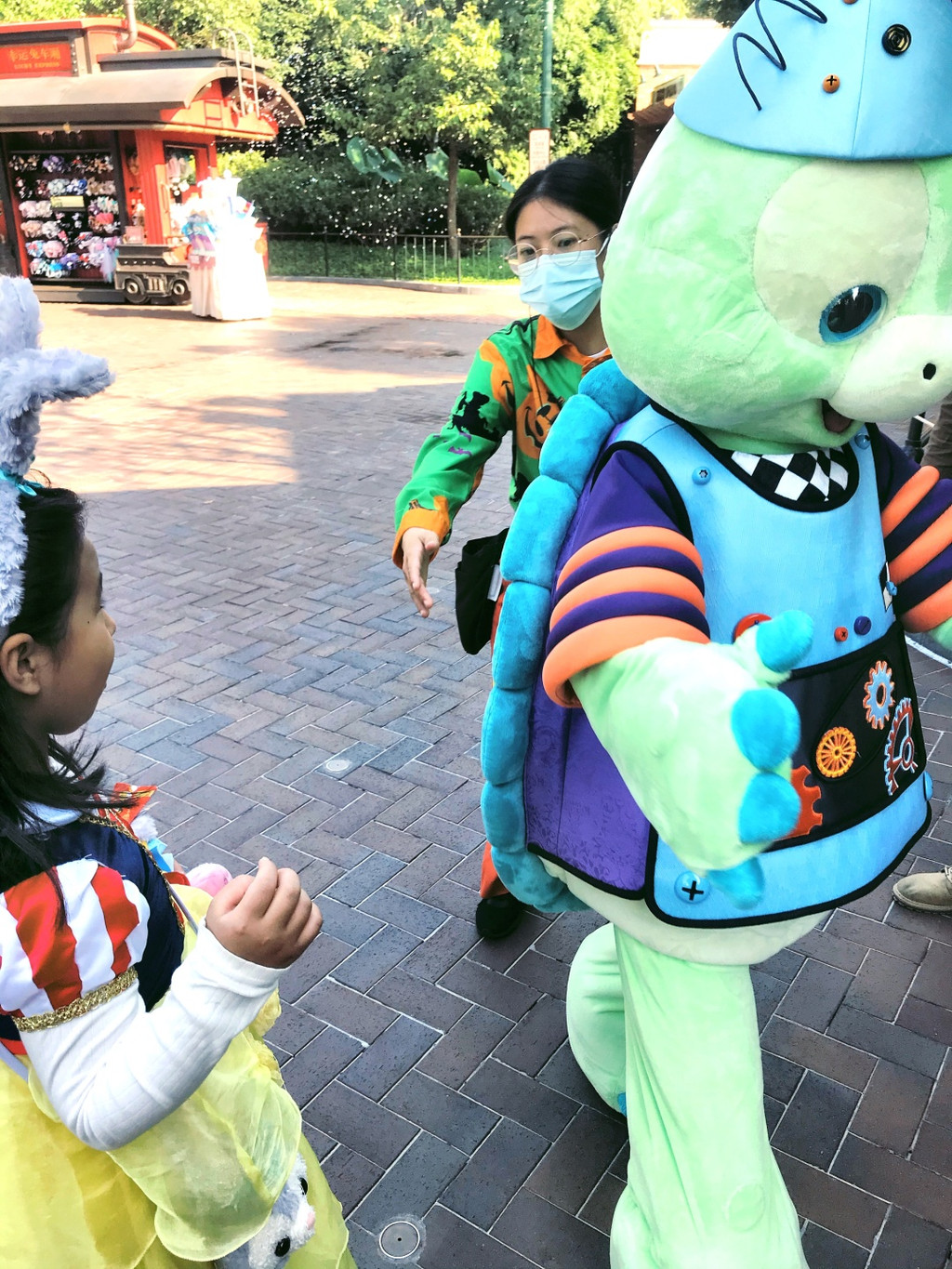 游行开始,气氛非常好,好几个工作人员和卡通明星和娇娇互动(吓唬她)超级开心啊,后面枚枚也来互动,激动啊,这些都要感谢生日徽章的加持哦。