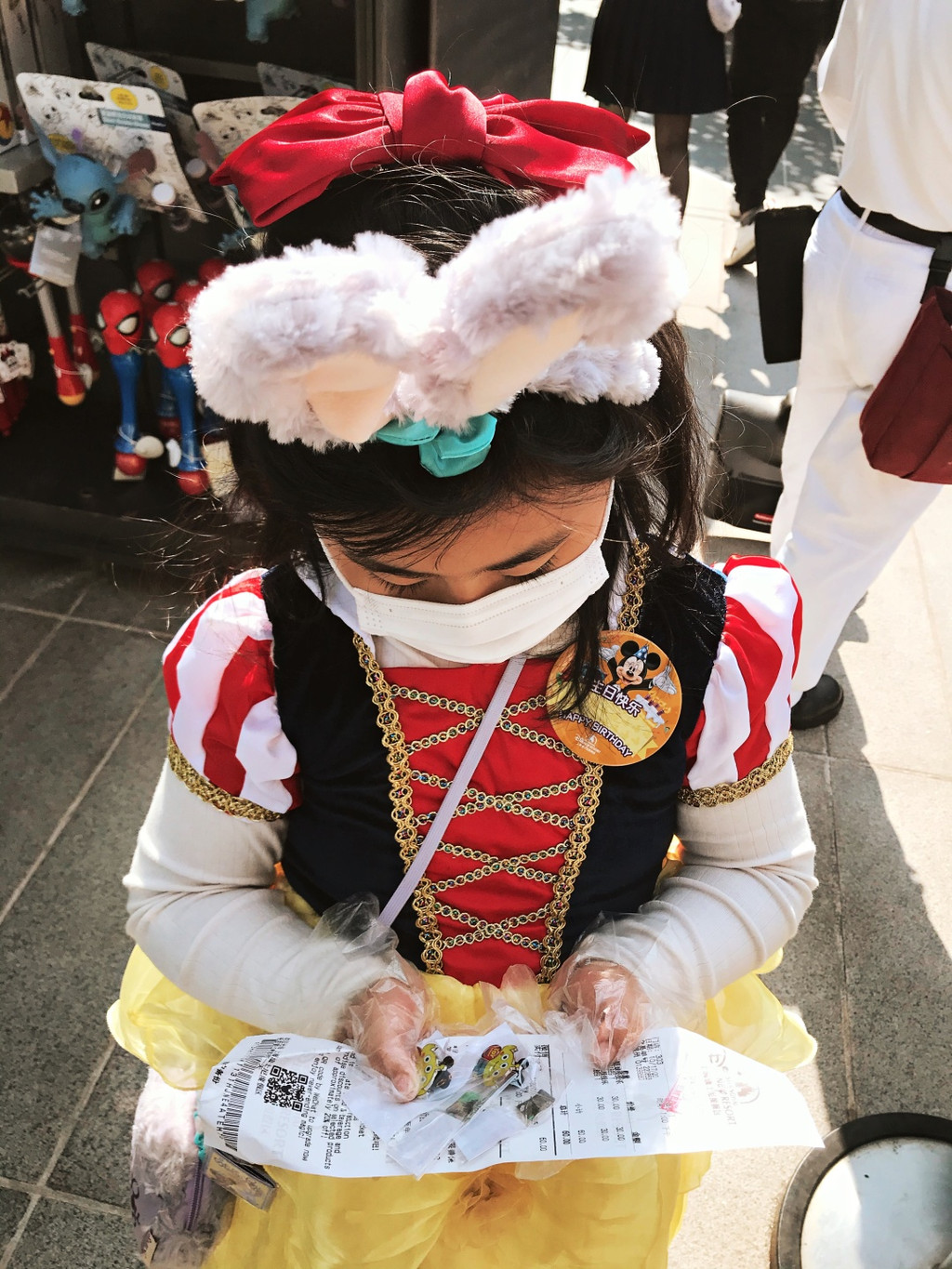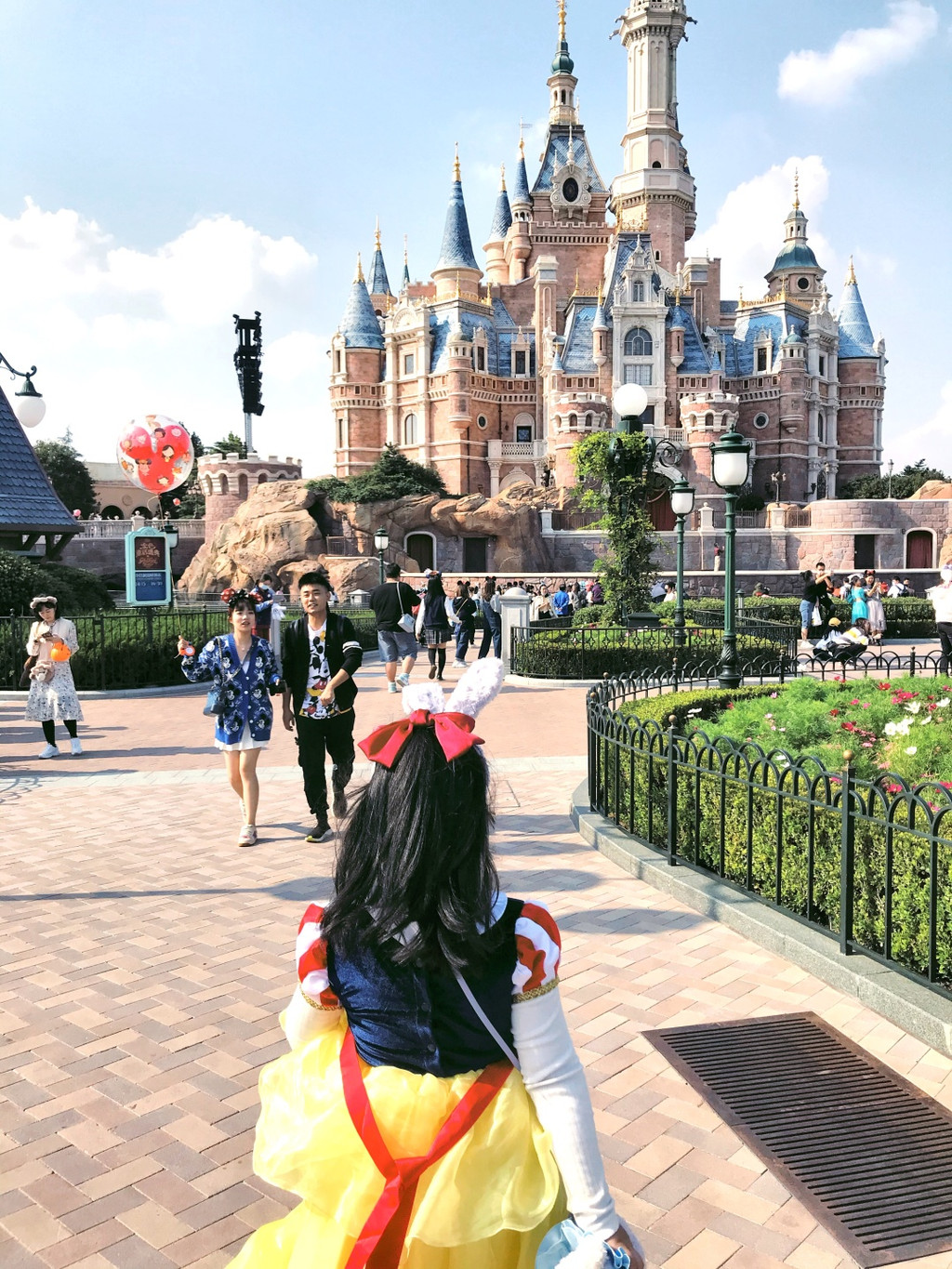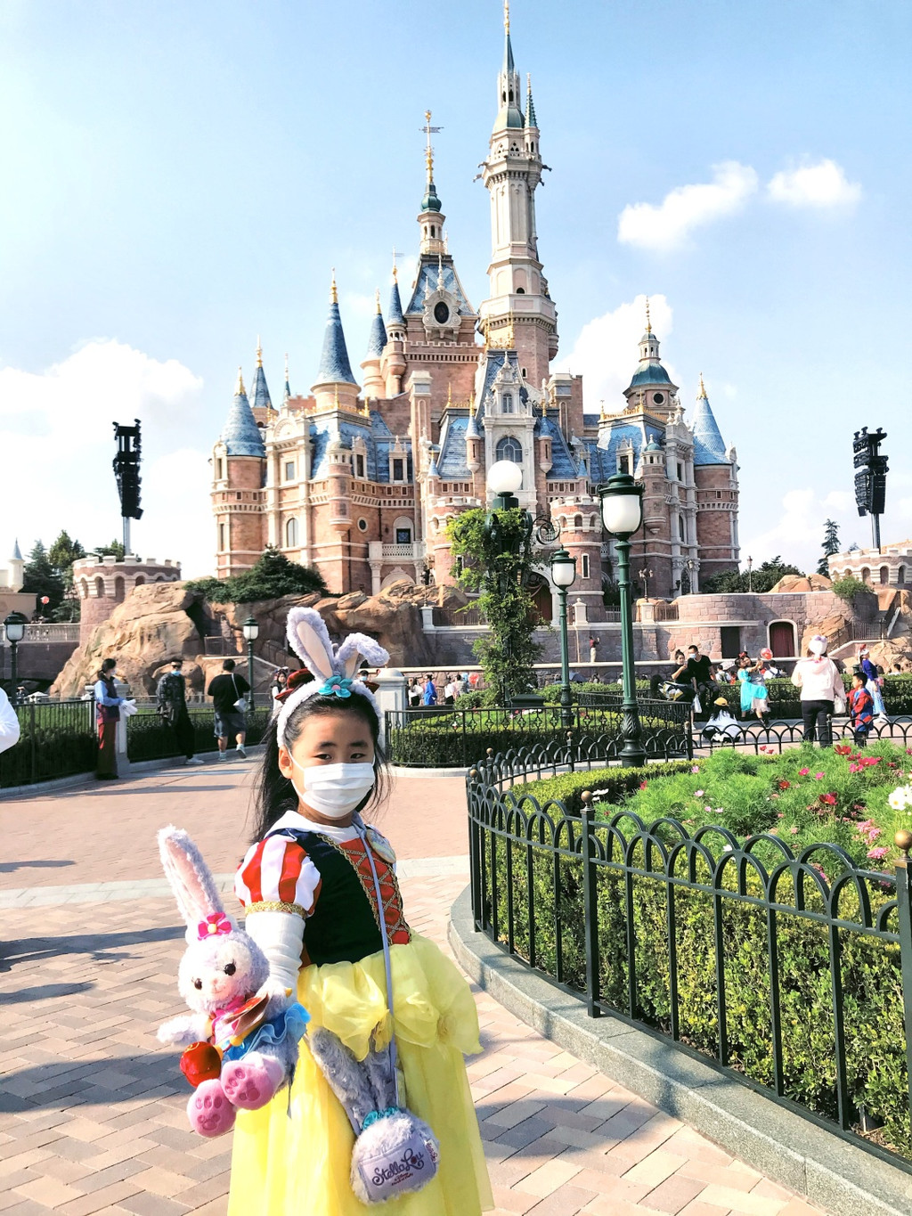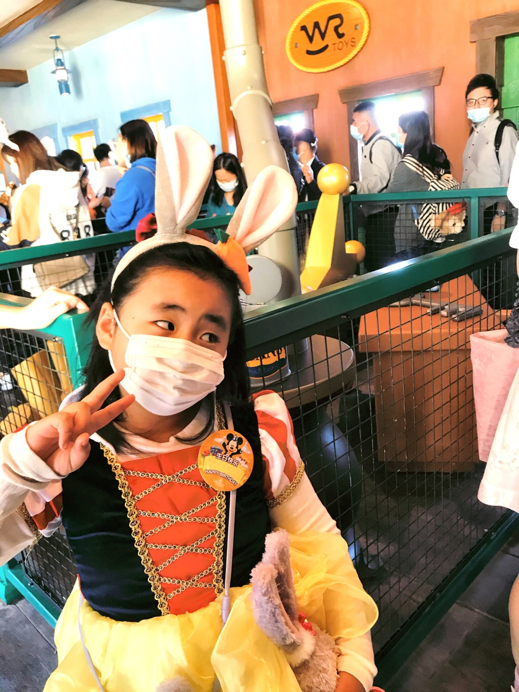 游行开始,气氛非常好,好几个工作人员和卡通明星和娇娇互动(吓唬她)超级开心啊,后面枚枚也来互动,激动啊,这些都要感谢生日徽章的加持哦。