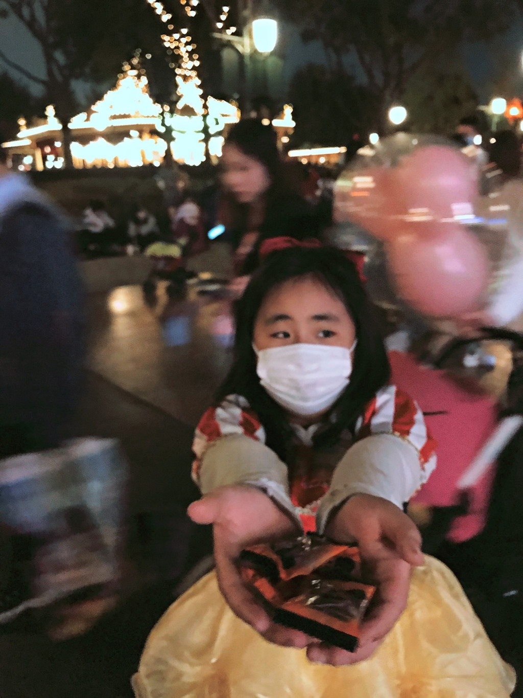 我过去发现店里的工作人员的糖果都分光了。这时候转身发现路边的小推车,我让娇娇鼓起勇气试试看,结果真的有收获哦,快要收摊的小哥哥给了娇娇好几块米奇软糖,不给糖就捣蛋的万圣节快乐终于达成。