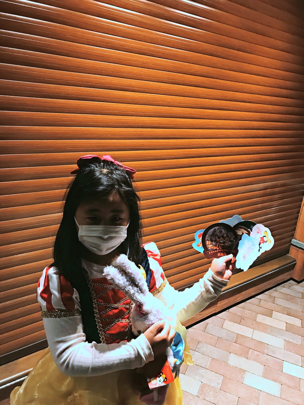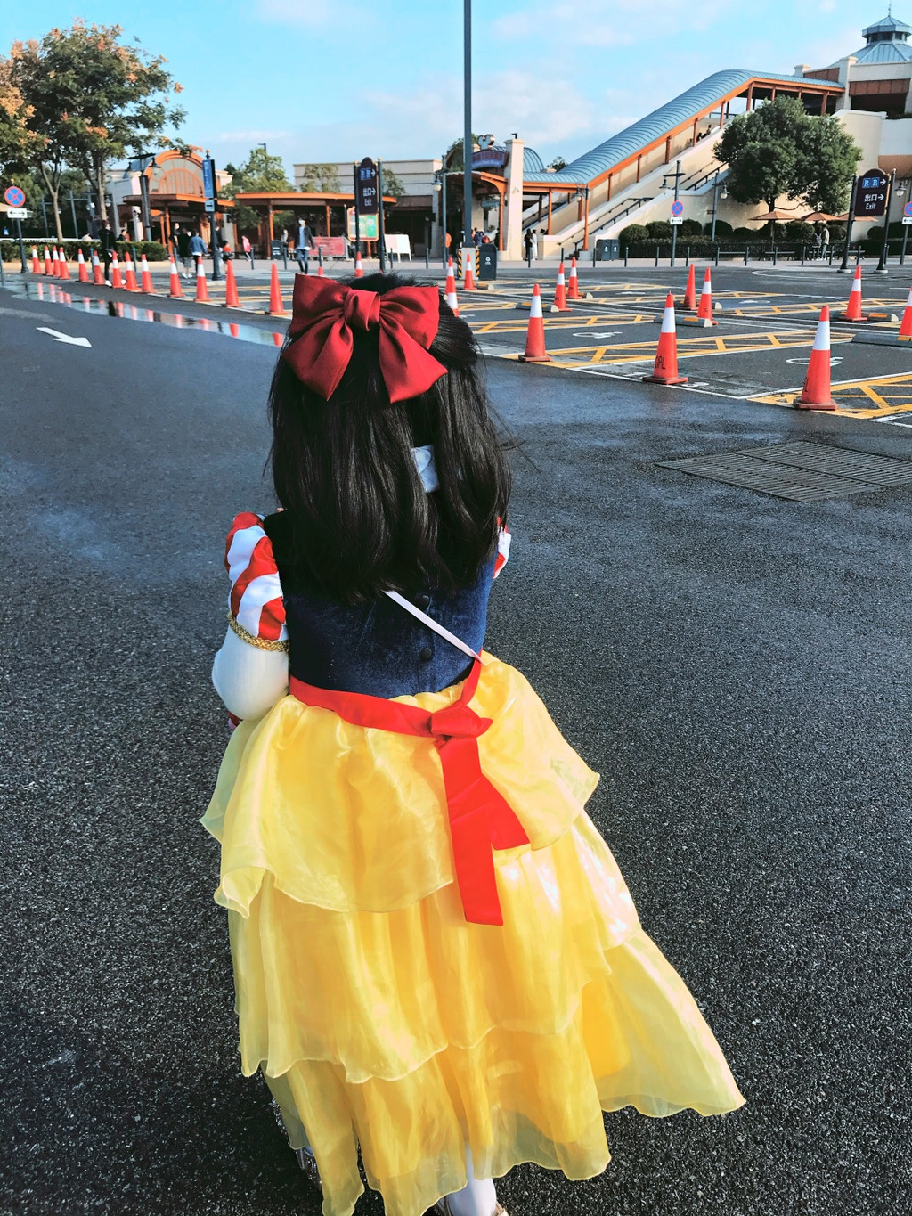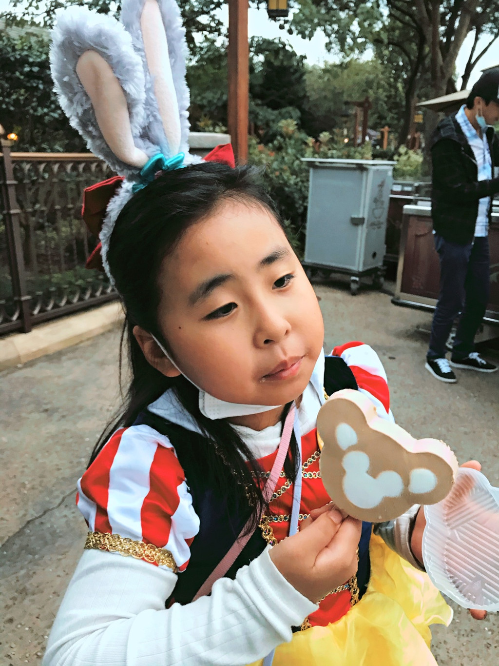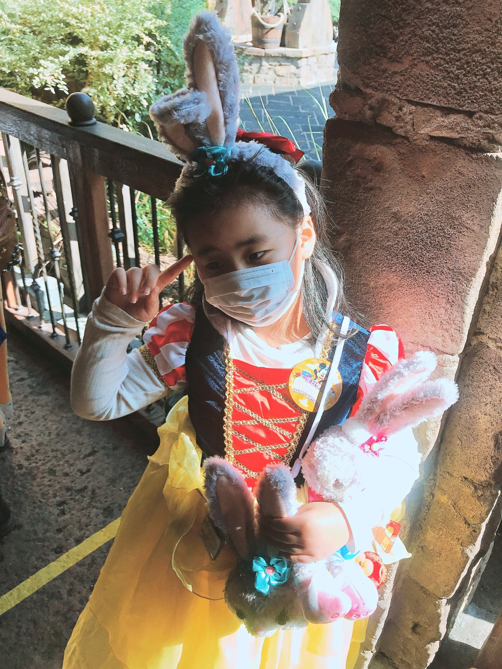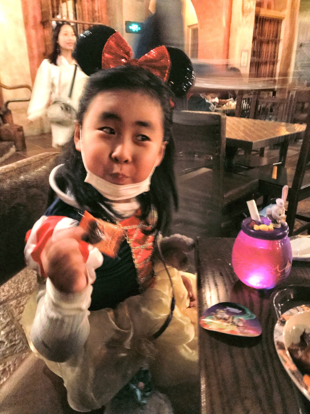 游行完毕,娇娇还想去玩爱丽丝的迷宫,可惜七拐八拐绕过去已经关门了。不过我们也还有满满的收获。娇娇今天一心想讨糖,但是只有中午吃饭时候工作人员主动送了块给小寿星,其他问了几个工作人员都没有。