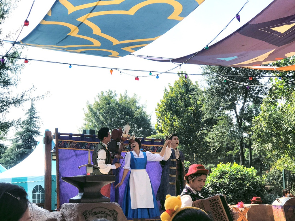 逛到梦幻世界正好看到一个露天演出,也算打卡一个新的项目。对了因为我们去那天巴博萨是10:30开门,所以吃完饭就来不及去看11:30的冰雪奇缘,如果和我们路线差不多,又在餐厅10点开门后就餐,那用完餐后可以赶快去刷一个冰雪奇缘欢唱盛会。