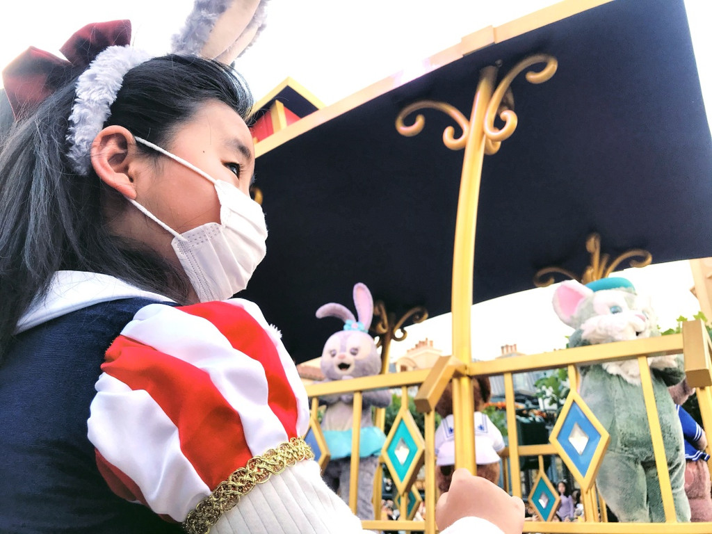 发现现在在等待的时候大家都会坐在地上,但是花车开始,就都站了起来。东京迪士尼是要求第一排的人必须坐着观赏,不能挡住后排的人。其实坐着看视野也很好,我这次就是坐着看完的,不累,也能喊到迪士尼明星互动。