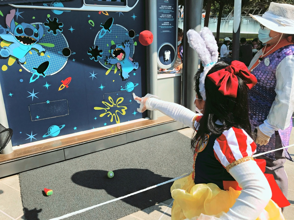 这次来之前我就心心念念要打卡网红史迪奇丢丢球,这个在明日世界,进去一试果然太难了,也才明白网络人家扔球能红的原因了,真的好难进。不过30块四个球,一个球没进也可以拿个徽章,徽章背面价格是49,后面可以去换其他喜欢的款式。扔进一到两个球是一个肩带,拍我前面的一个人高手长的男生说是常打篮球的,最好记录也就一局进了两个,每局的成绩是不能累加的。如果进入三个球就可以拿到巨大的史迪奇了。