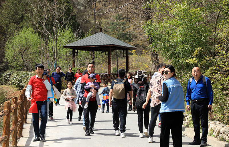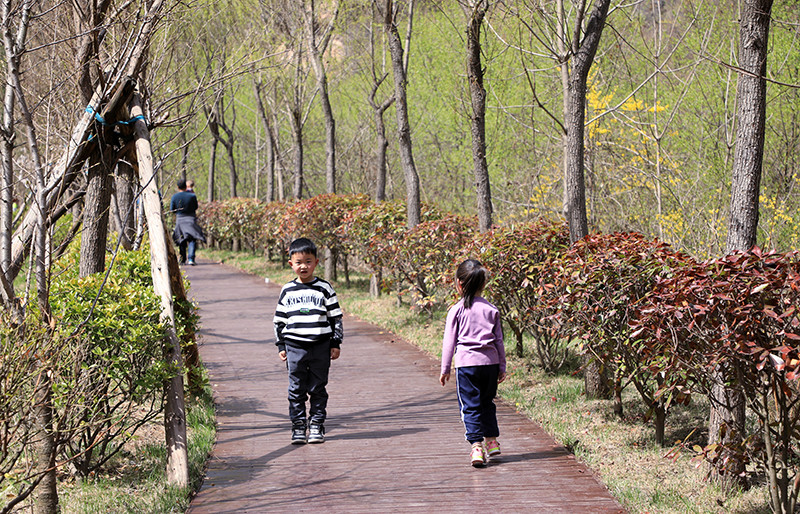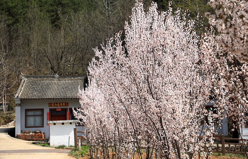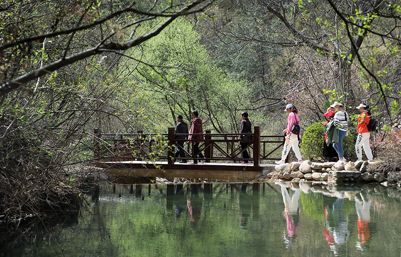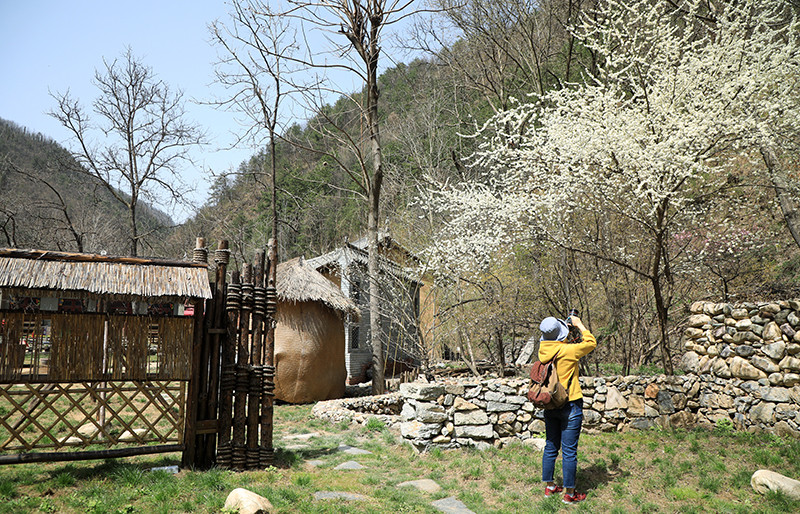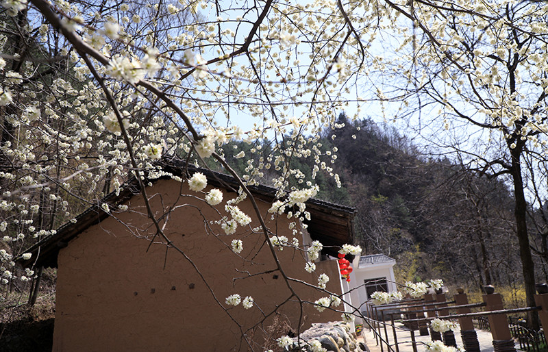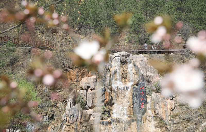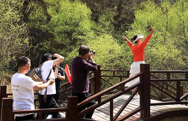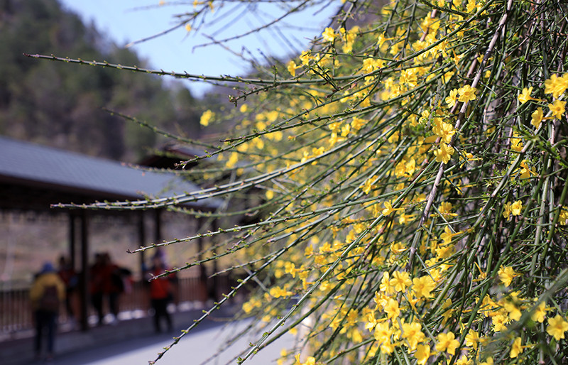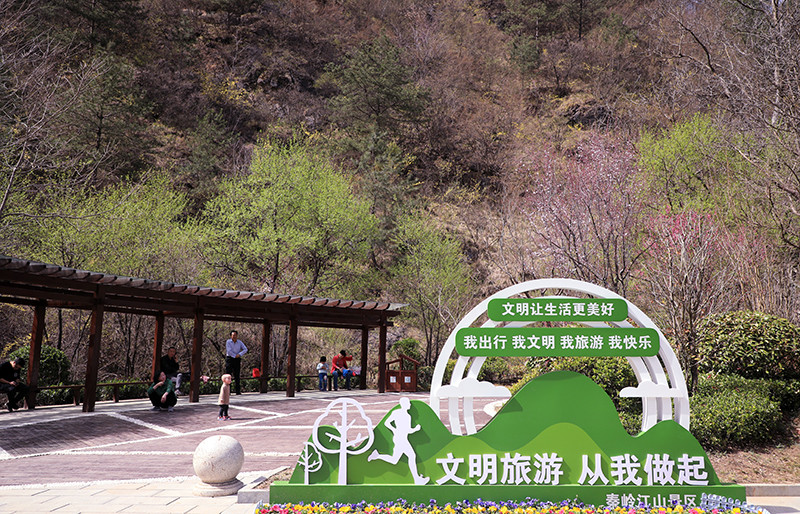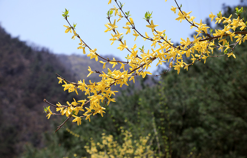 走进秦岭江山景区,溪水欢歌、鸟鸣啾啾,迎春花在石砌护墙上灿烂绽放,红叶李装扮村庄、连翘花装饰山峦,一池水映照秀美江山。这里,不愧是西安人的后花园,没有雾霾的侵扰,翻过秦岭,处处都是一片春明景合之象。