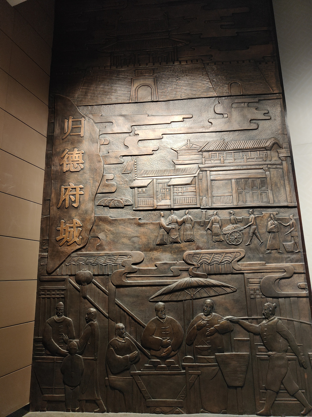 历史三厅“国运所系”,进门就是一幅铜版画,有展书阅读的画面,也有长亭送别的情形。东汉末年起经魏晋南北朝,时局动荡,尤其是两晋之际,中原世家大族纷纷南迁。但从曹魏官渡之战和梁伐北魏的战争中可知,睢阳依然是当时的战略要地。