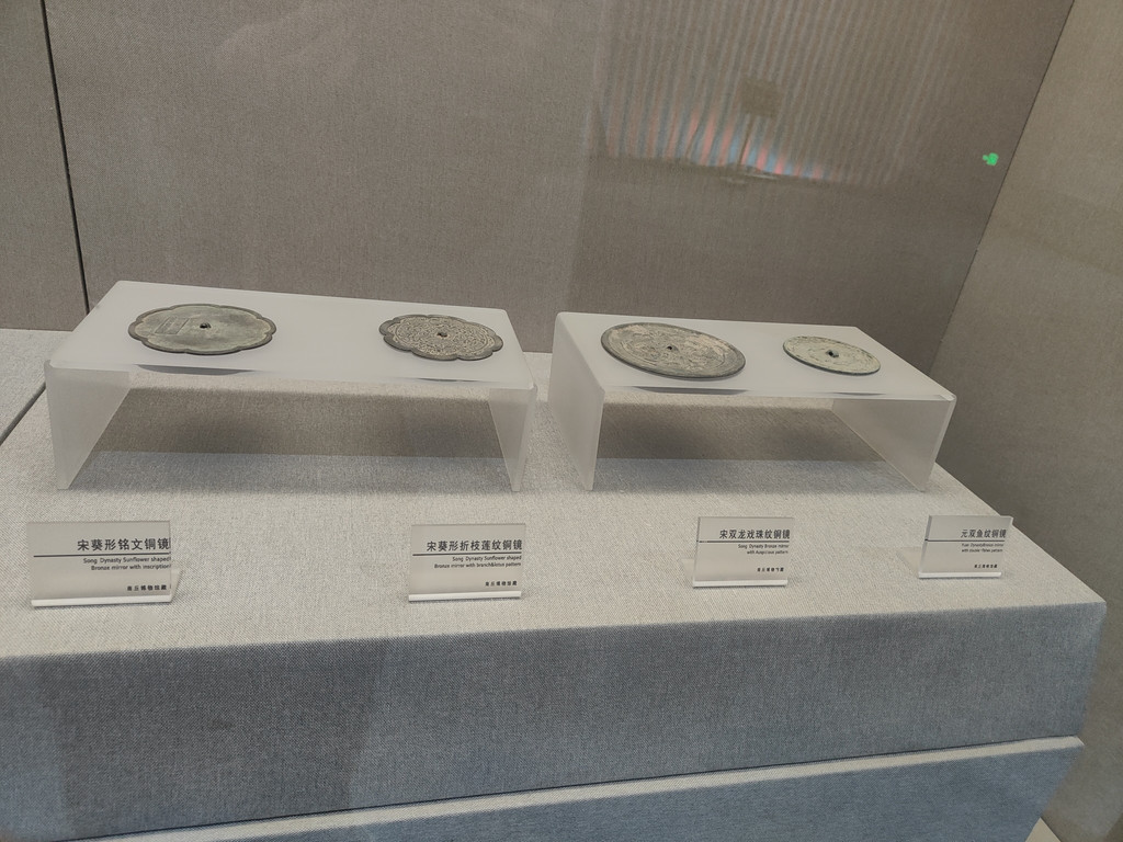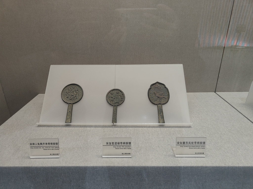 但要说到精巧,还得是宋朝的铜镜。神人龟鹤齐寿带柄铜镜、宋加官进禄带柄铜镜、宋如意形凤纹带柄铜镜都是便于携带的小型铜镜,但背面的雕饰可一点都没有偷工减料。当然,葵形、圆形的铜镜,背面的雕饰也极其精致。还有一面元双鱼纹铜镜,构图简洁大方,雕工也很精致。