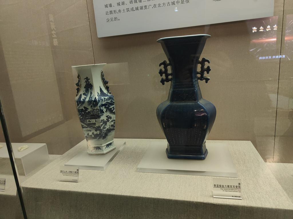 青花山水人物纹六棱瓶的图像内容太丰富了,瓶底是竹叶,瓶身则是山水画,有人物亭台,山川河流,青松翠柏。祭蓝描金六棱双耳瓷瓶的釉色用的是很漂亮的深蓝色,瓶身上居然还镌刻着文字,但是没看出来是什么内容。