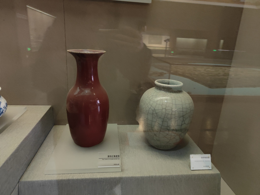 清朝的瓷器还数粉彩最具有辨识度,这种瓷器颜色艳丽,图案丰富,但有的看着也挺素雅。青花也很普遍,不过大多数的青花图案过于满了,倒是一只撒蓝龙纹直颈瓷瓶虽然器皿不大,但釉色深浅错落,纹饰简洁。钧红秞瓷瓶的款式和釉色都很出彩,尤其是红釉相当艳丽。