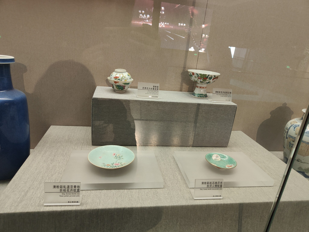 清朝的瓷器釉色要艳丽得多,清粉彩开光四季花卉纹盖碗不管盖子还是碗身,都以淡黄色为底,绘有颜色清雅的四季花卉,边缘处还有纹路。青花缠枝莲纹罐虽然罐身的青花很繁密,但以一朵青花作主要纹饰,四周缠枝密而不乱。祭兰釉三足炉的粙色真的是太漂亮了,连一向喜欢青瓷和白瓷的我,都格外钟爱。另一只祭蓝三足瓷炉虽然器型相似,颜色也是兰釉,但釉色不如那一只清亮鲜艳。
