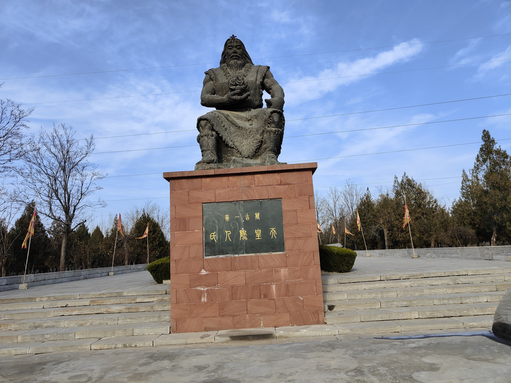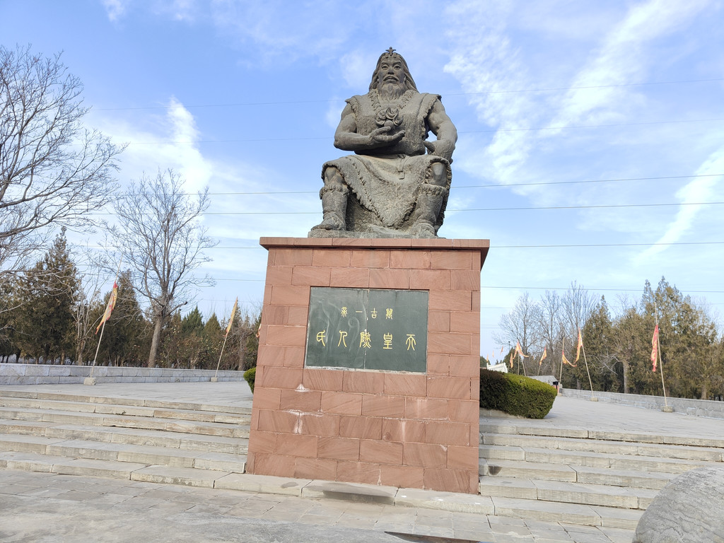 神道正中,陵寝之前,是一尊燧人氏的雕塑。他坐于高台之上,原始部落首领的打扮,一手托掌置于胸前,一手置于左膝。高台上刻着两行字“万古一帝”“火皇燧人氏”。