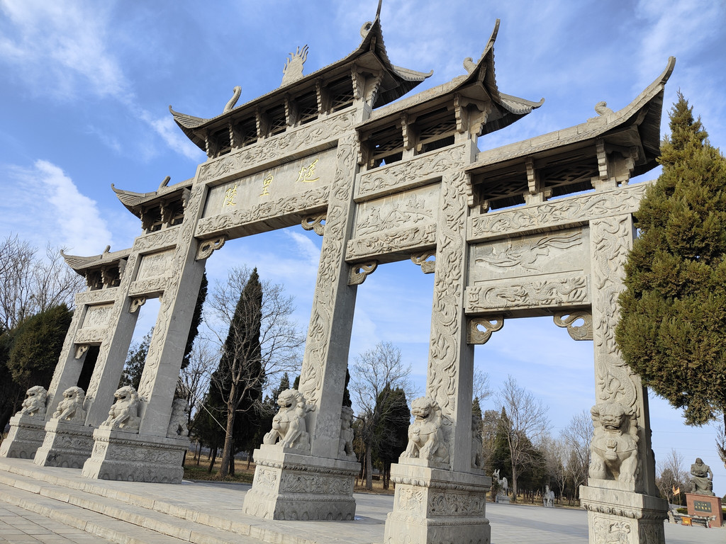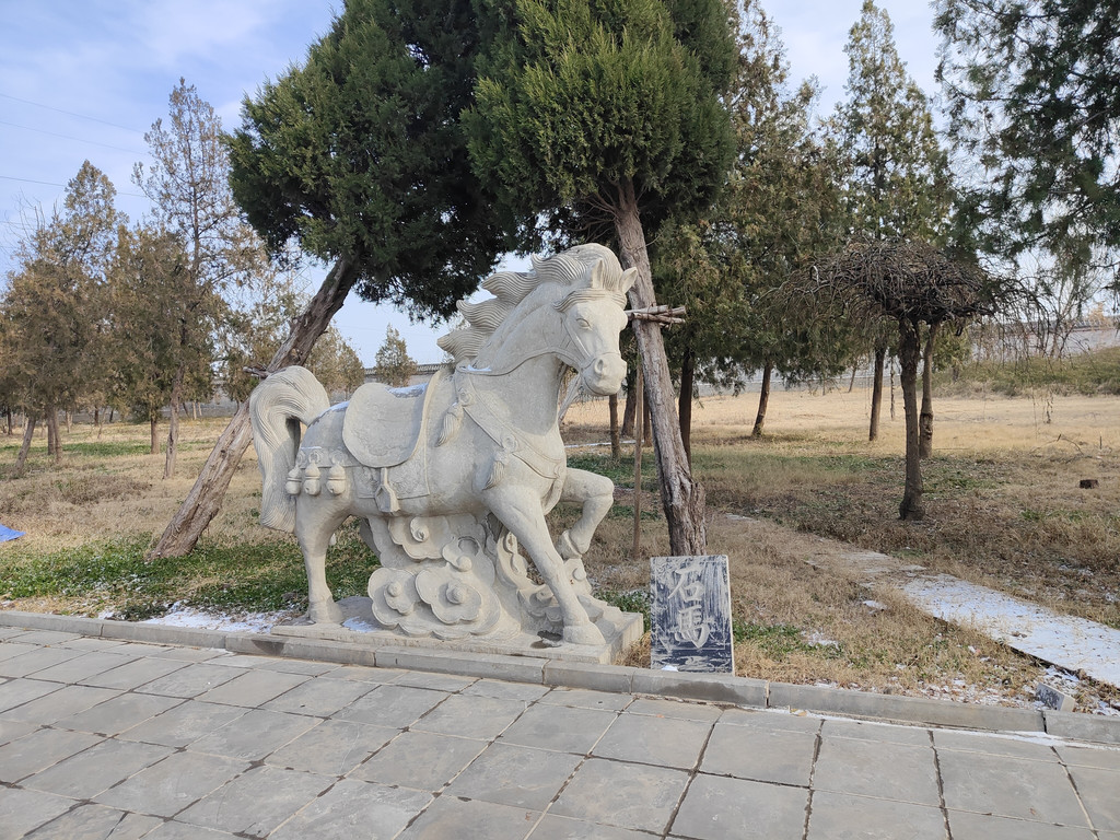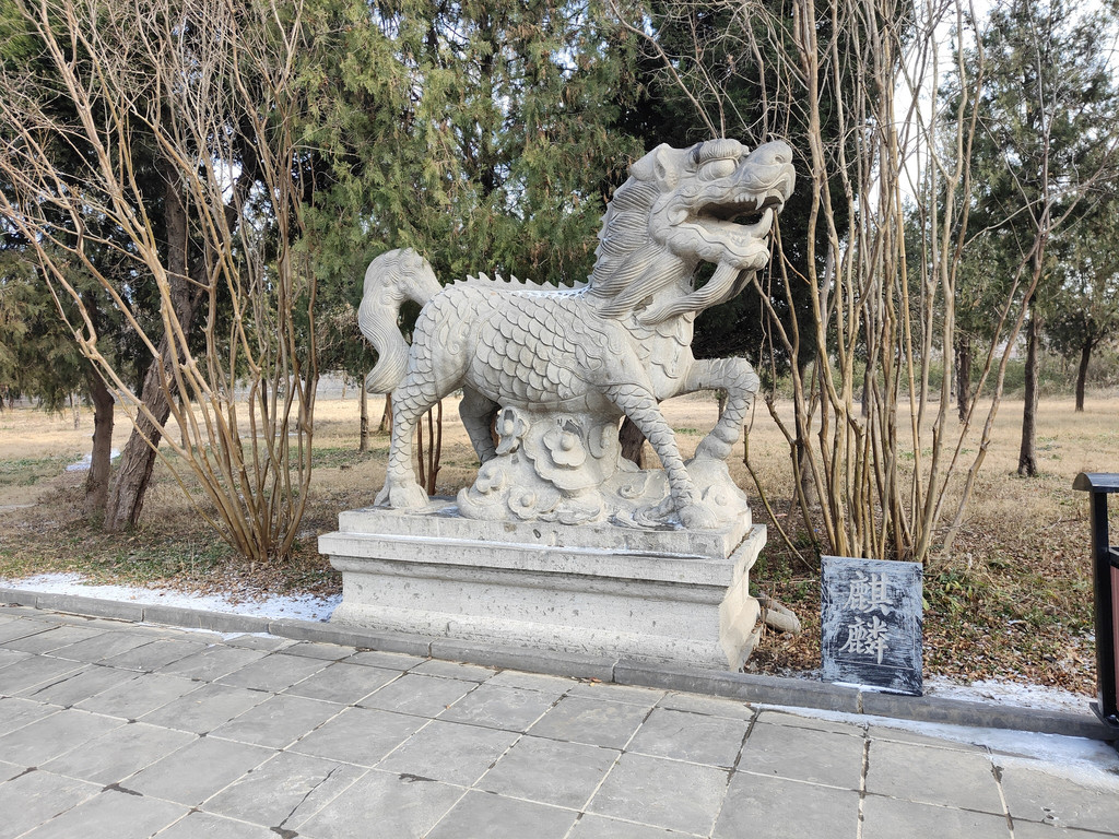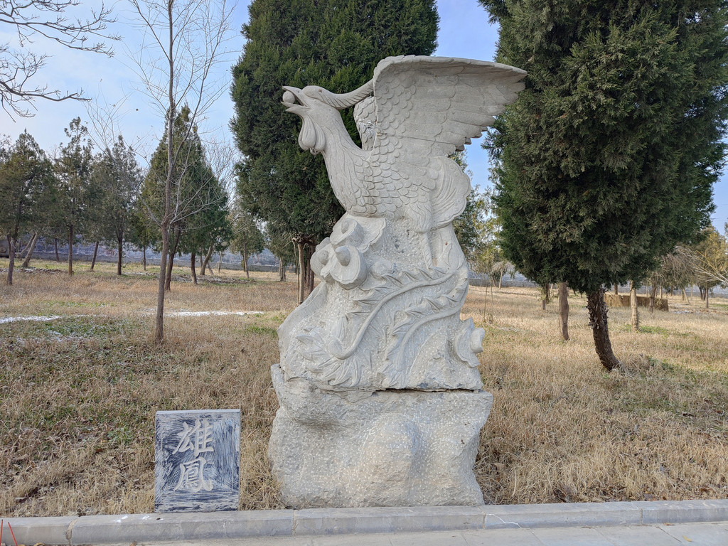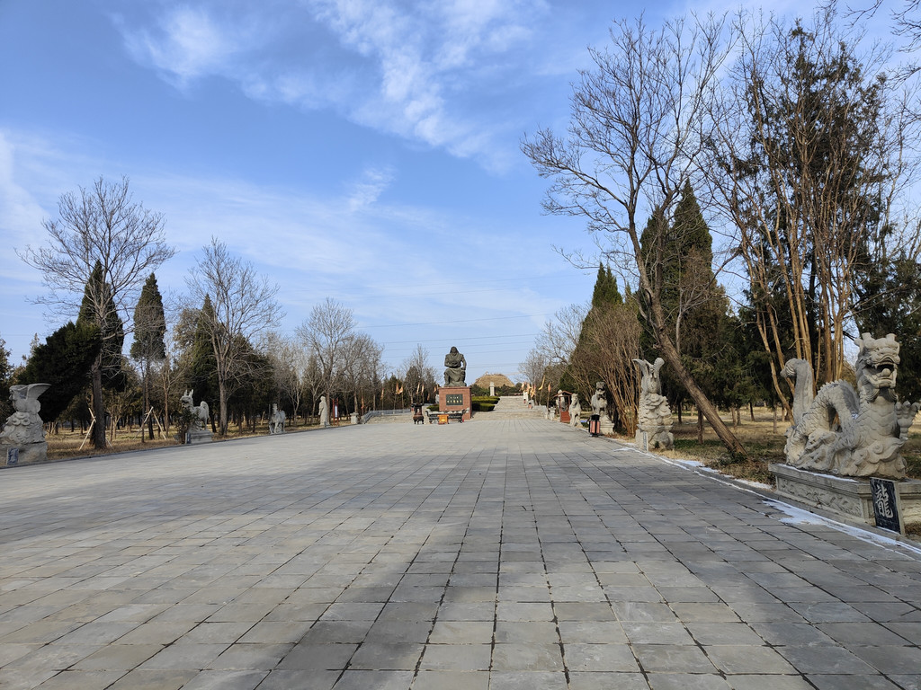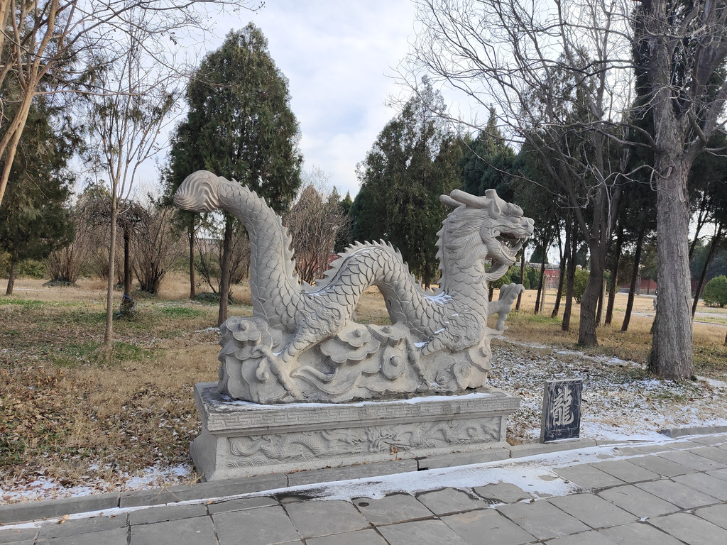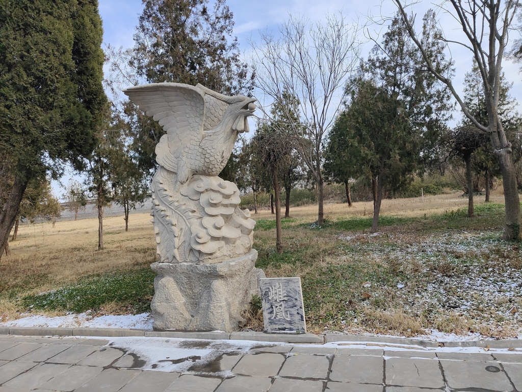 走过牌坊,是宽大的神道,又称天道,指“墓前开道”。两侧的石像生看起来有的是新建的,有的倒像是有些年头的。当然,不可能是燧皇陵初建时候的原物,大概也是从哪里搬来的吧。龙和凤象征身份与等级,万古第一皇的天皇,自然应该是最高的等级。麒麟象征仁义之君和吉祥光明,马是古代帝王南征北战统一江山的坐骑,翁仲是秦始皇的爱将,英勇善战,为人忠诚,现在用来镇守神灵。神道分为三节台阶,每节台阶长三十三米,合计九十九米,寓意“九五之尊”。神道上刻着火和枫叶的图案,寓意“风风火火”。