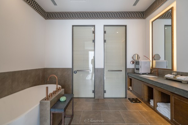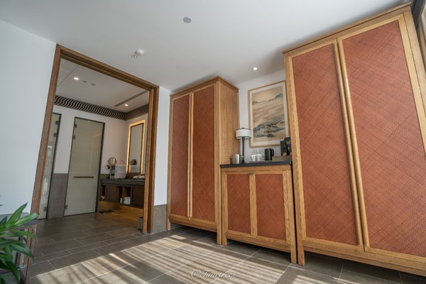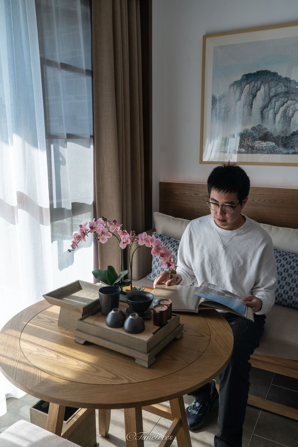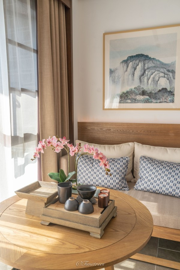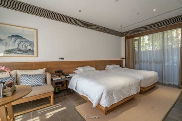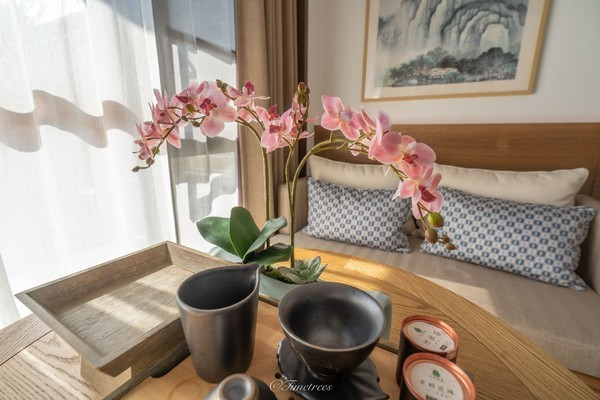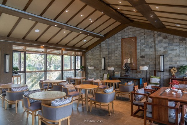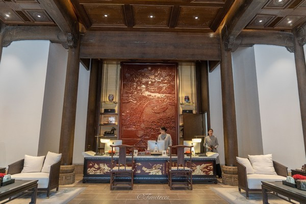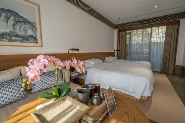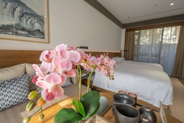 室内各处的装修和用具无一不彰显着酒店超自然的追求和品味。大量运用留白面、黑古铜、原木色和复古陶板等元素从而达到一种东方禅意的设计塑造核心,处处体现着雅致的生活艺术和徽州美学,需要用心去体味和感受。