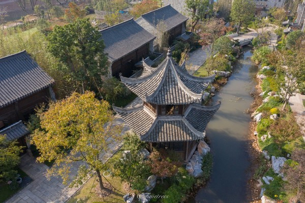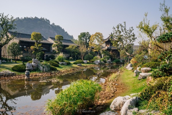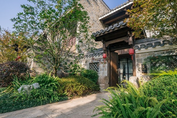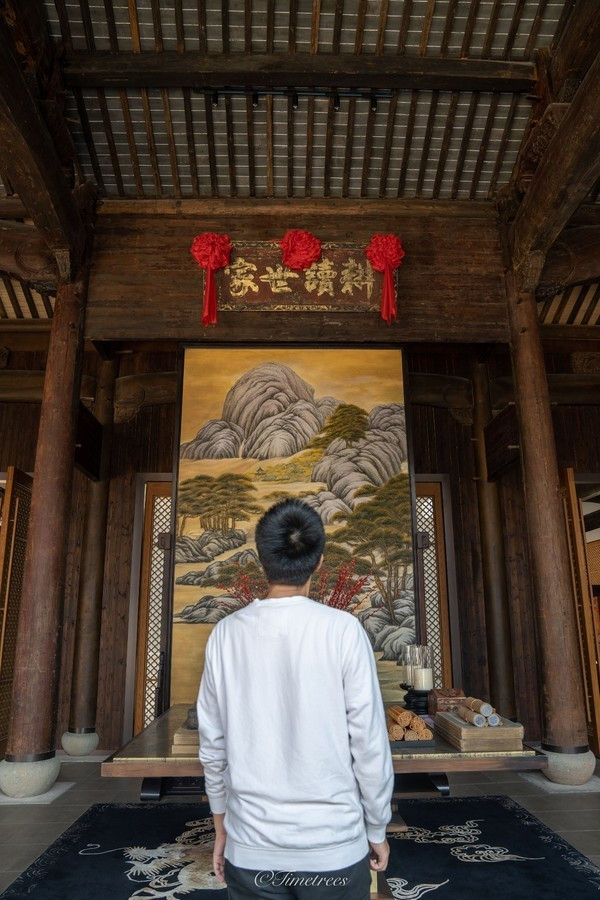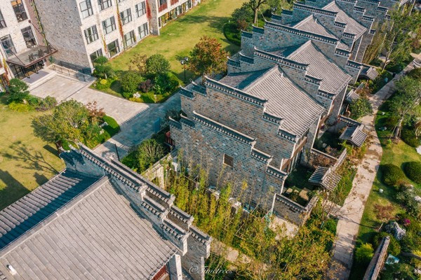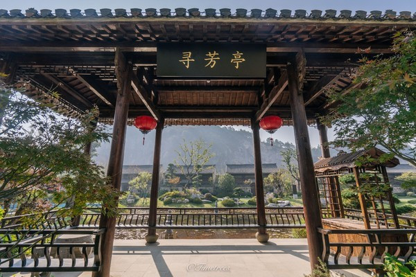 以木石构筑,由雕梁画栋,各式独栋的古院和高低错落的马头墙相印达观。古树、古宅、青砖绿瓦、山景交融,共同还原出江南古徽州的美好面貌。