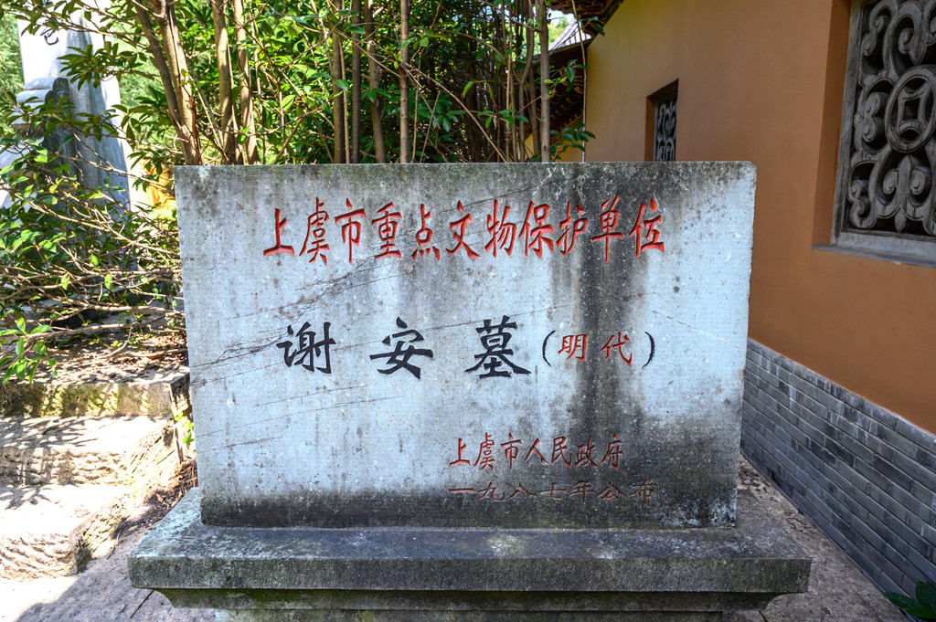 在牌坊旁有一块石碑,谢安墓为上虞市重点文物保护单位,于1987年立。