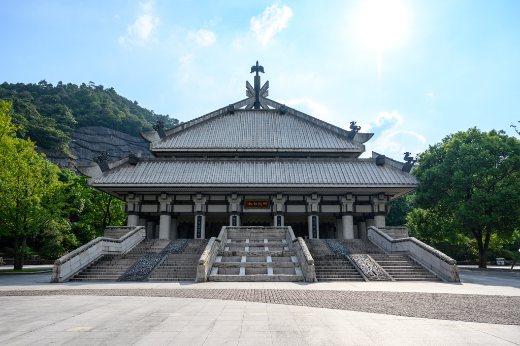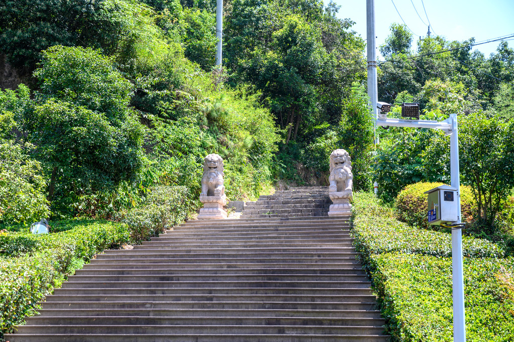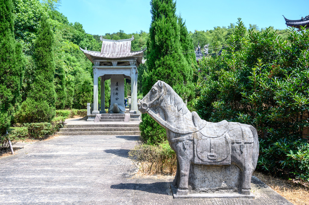 谢安墓坐落在东山之巅、头枕峰峦,一旁与著名千年古刹国庆寺相邻,为一风水宝地。国庆寺历史非常悠久,早在谢安祖父谢衡定居东山时就已存在,比著名的天台国清寺还要早300多年历史,本想进去参拜一下,但寺院大门未开,于是直接绕过去了谢安墓。