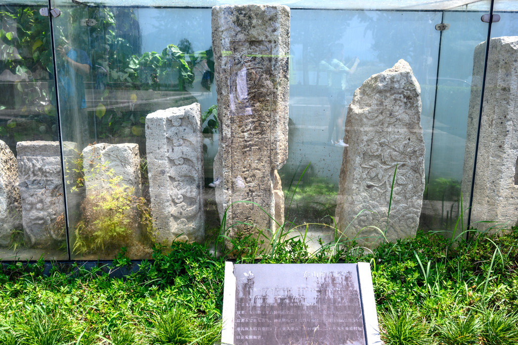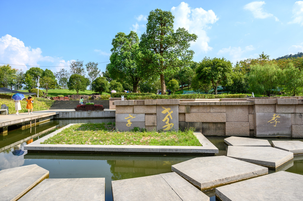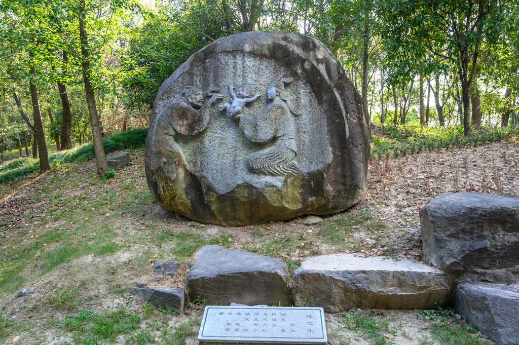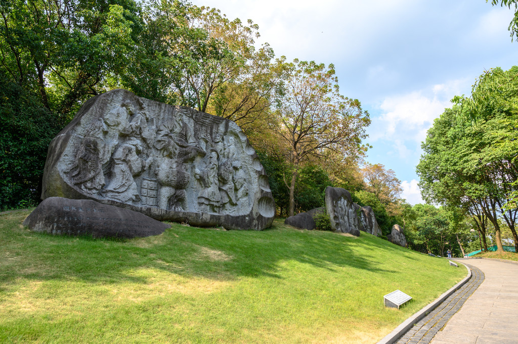 沿着指示牌向着大舜庙的方向走去,途中最先经过的是“神州舜迹”石刻,拥有18块各具特色的石雕作品,淋漓尽致地展现了舜帝的一生,舜帝是古代的“三皇五帝”之一,上虞就是舜帝的故里,在当地还有舜井、舜帝庙、舜帝陵等景点。