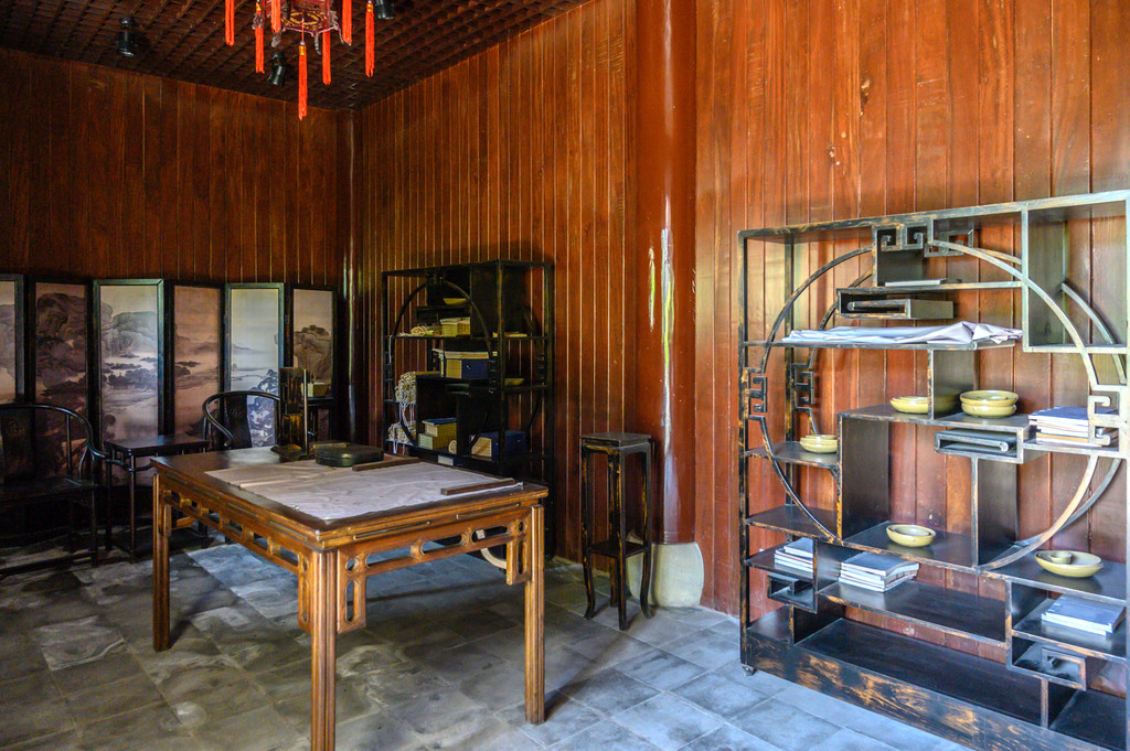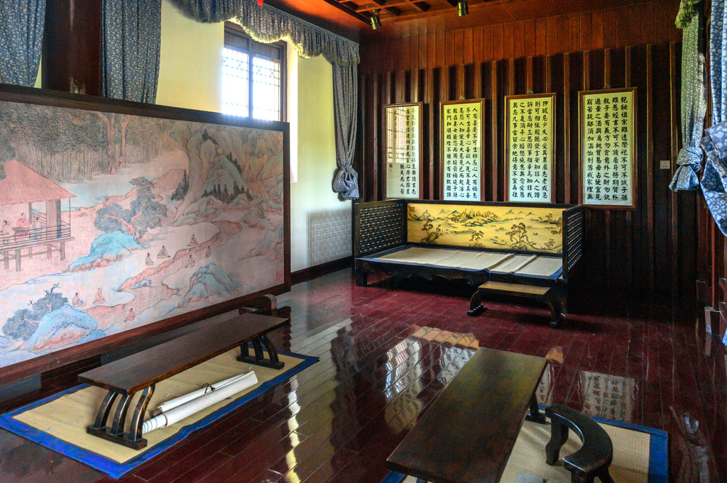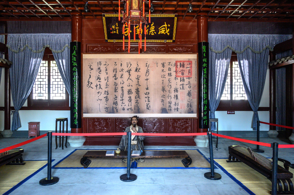走进前厅可看到一位男子雕塑坐在正中的位置,他是祝员外,左右两侧摆放着乐器,若有重要客人拜访祝府,在接待的过程中会有乐器演奏招待客人。